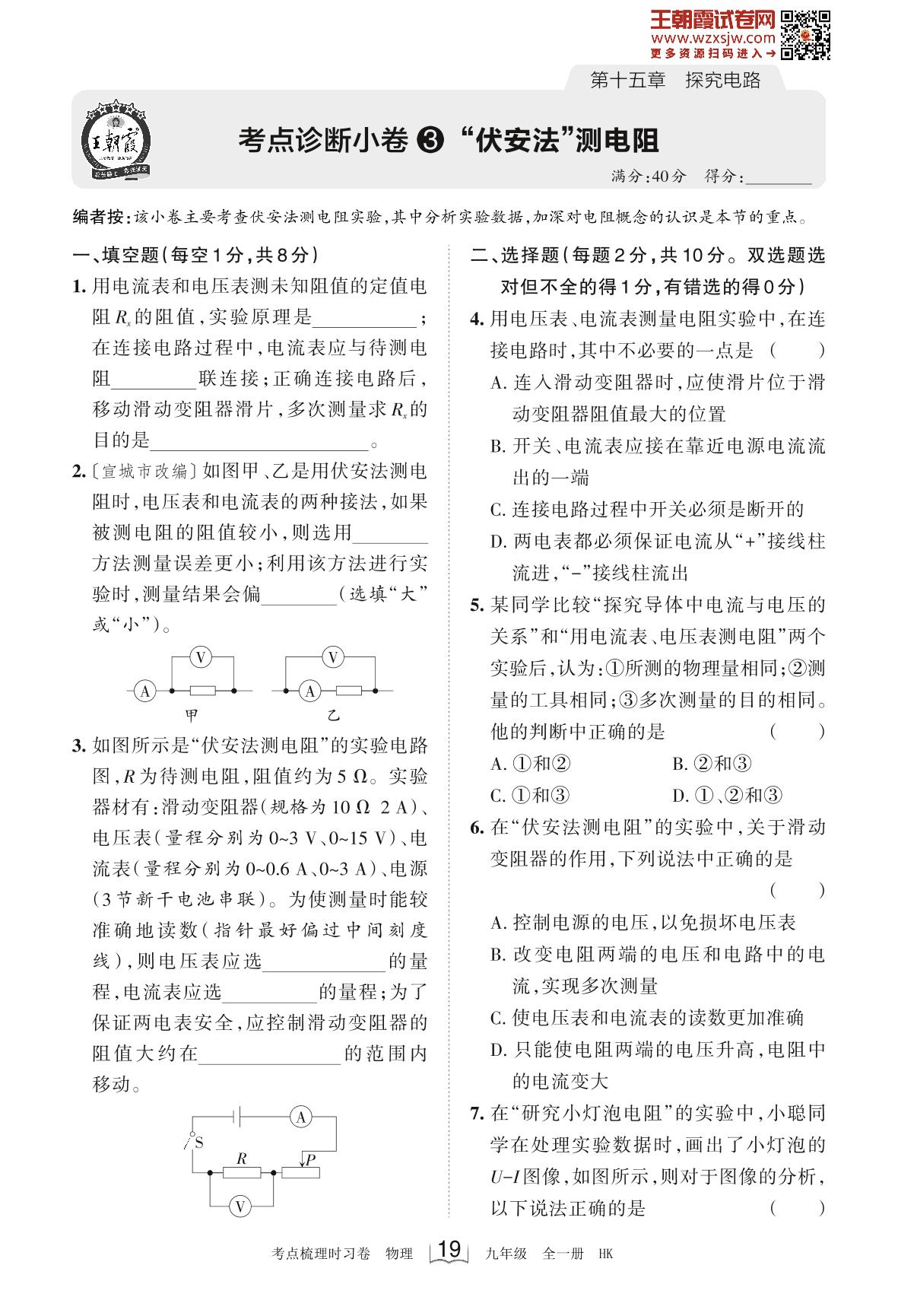 2023-2024学年九年级物理沪科版 第十五章 考点诊断小卷3 “伏安法”测电阻