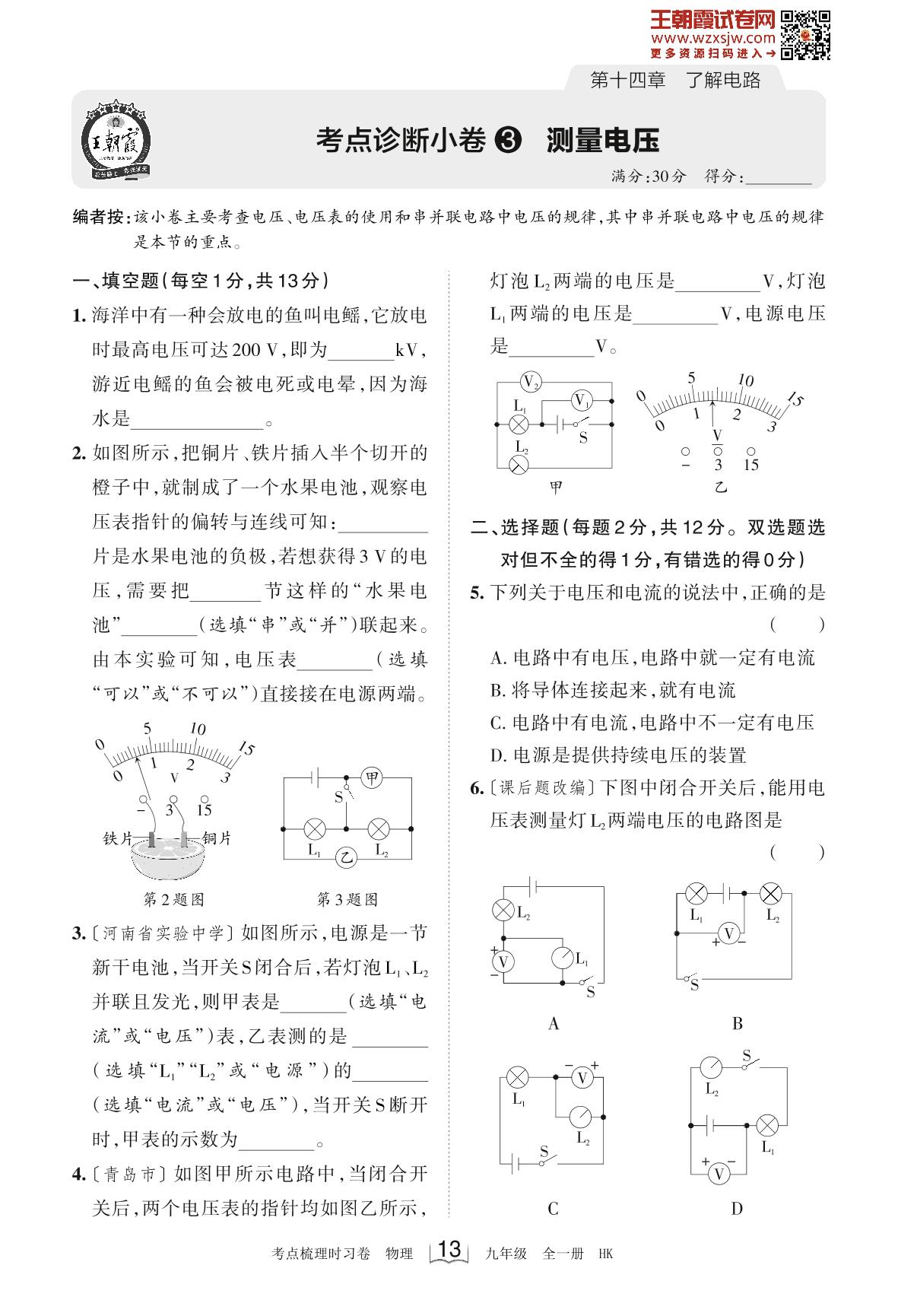 2023-2024学年九年级物理沪科版 第十四章 考点诊断小卷3 测量电压