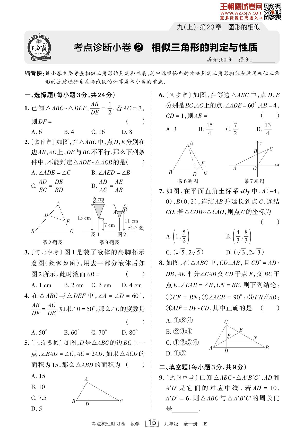 2023上册九年级数学华师版 第23章 考点诊断小卷2 相似三角形的判定与性质