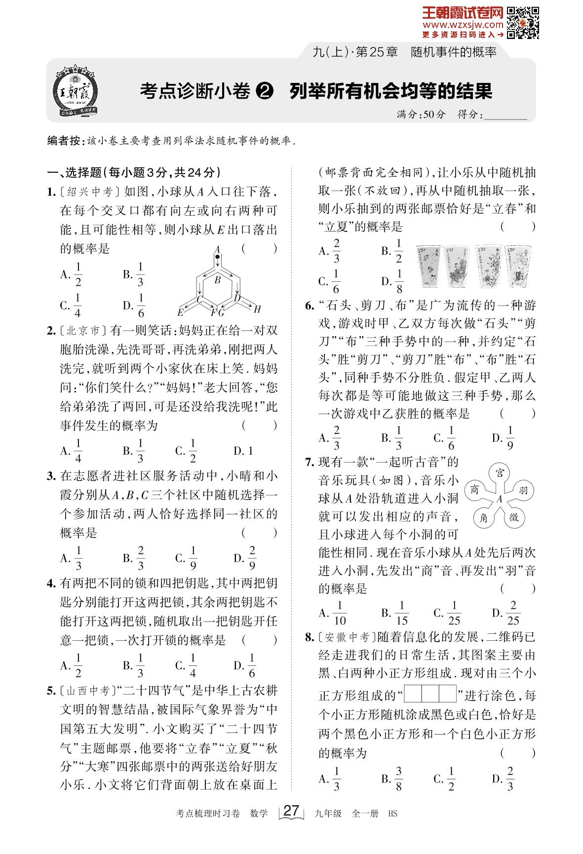 2023上册九年级数学华师版 第25章 考点诊断小卷2 列举所有机会均等的结果