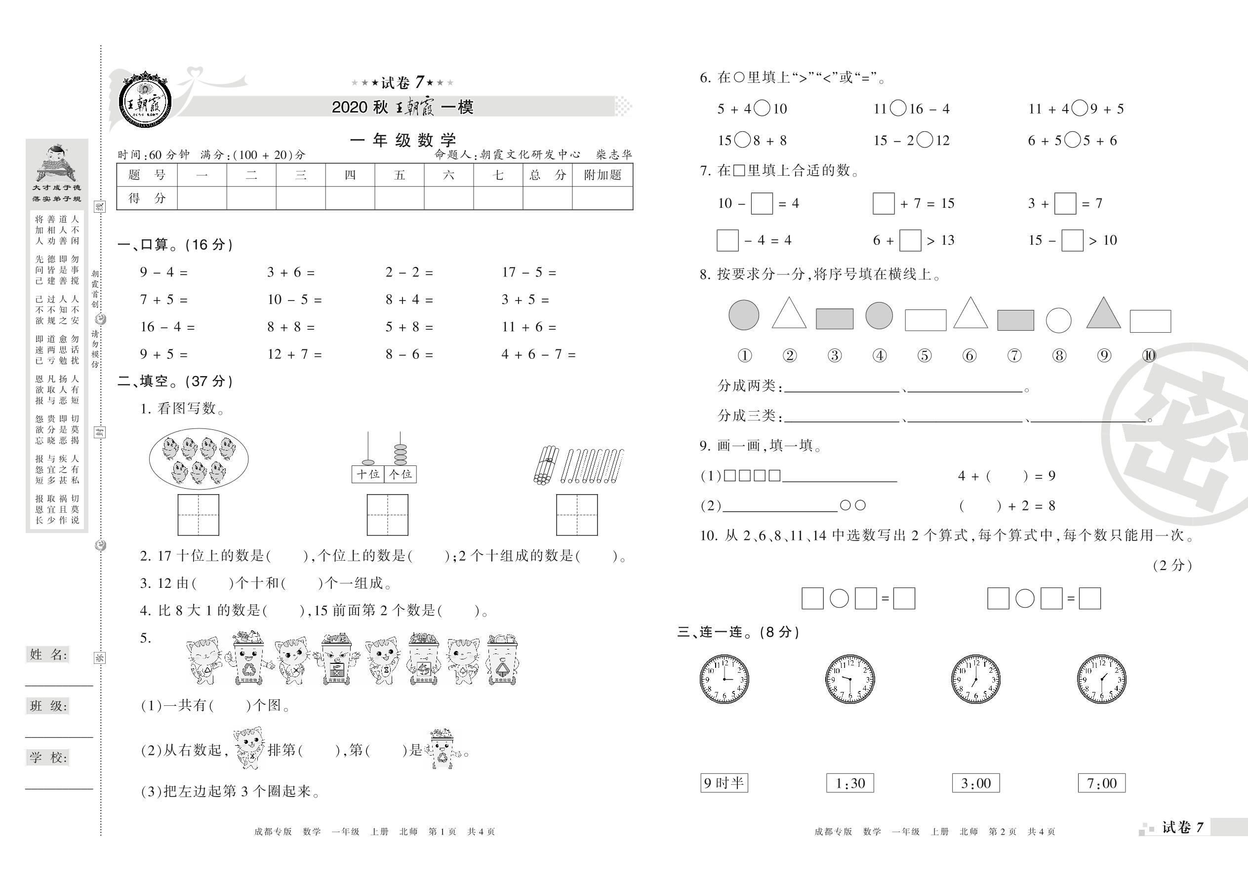 王朝霞期末模拟卷一年级上册数学(北师版)_R210802212013【7】