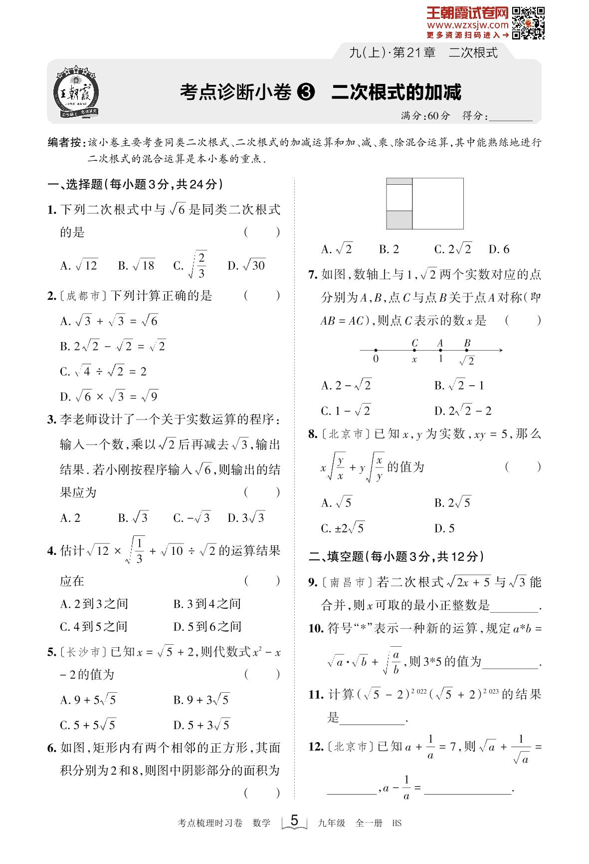 2023上册九年级数学华师版 第21章 考点诊断小卷3 二次根式的加减