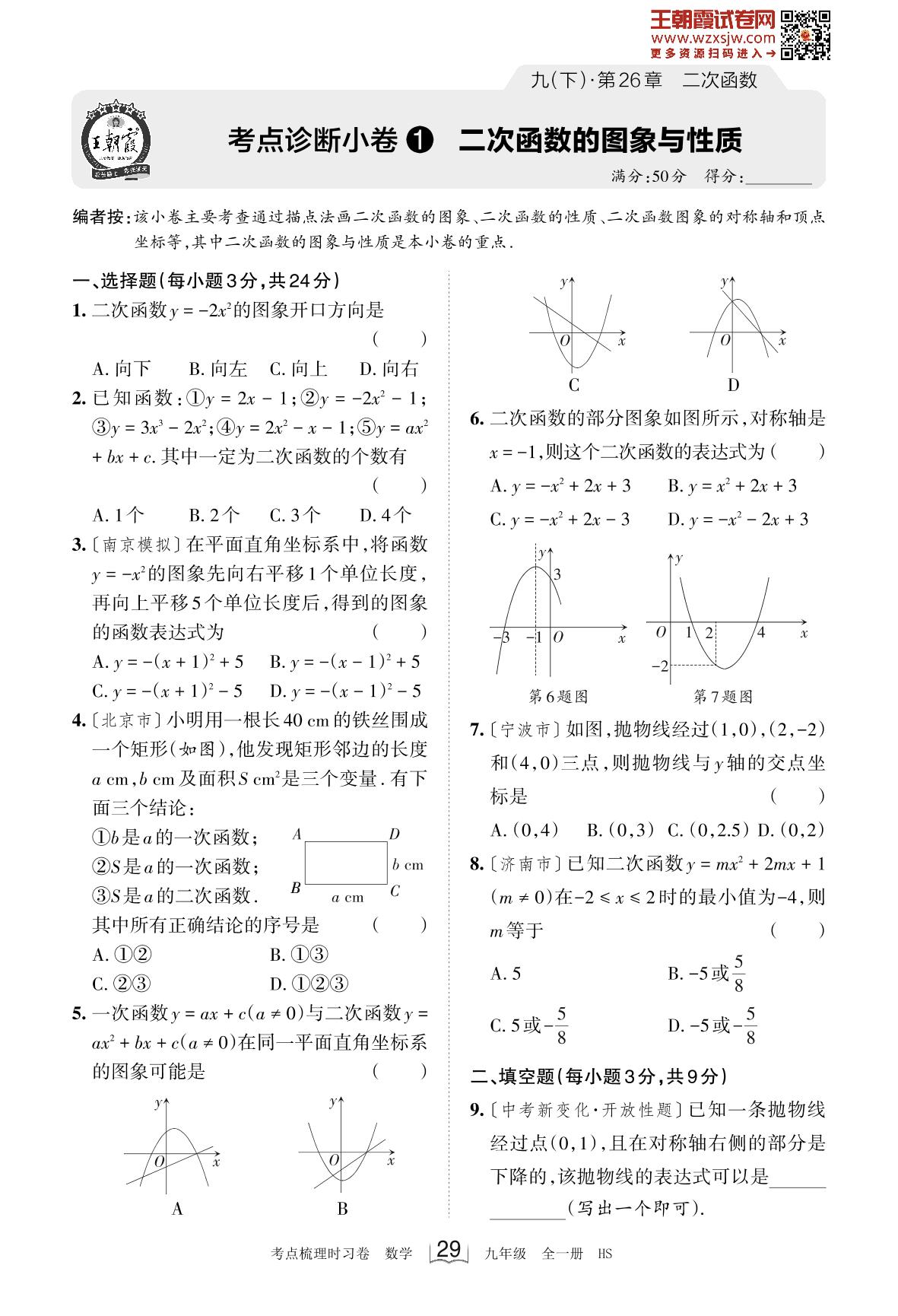 2023下册九年级数学华师版 第26章 考点诊断小卷1 二次函数的图象与性质