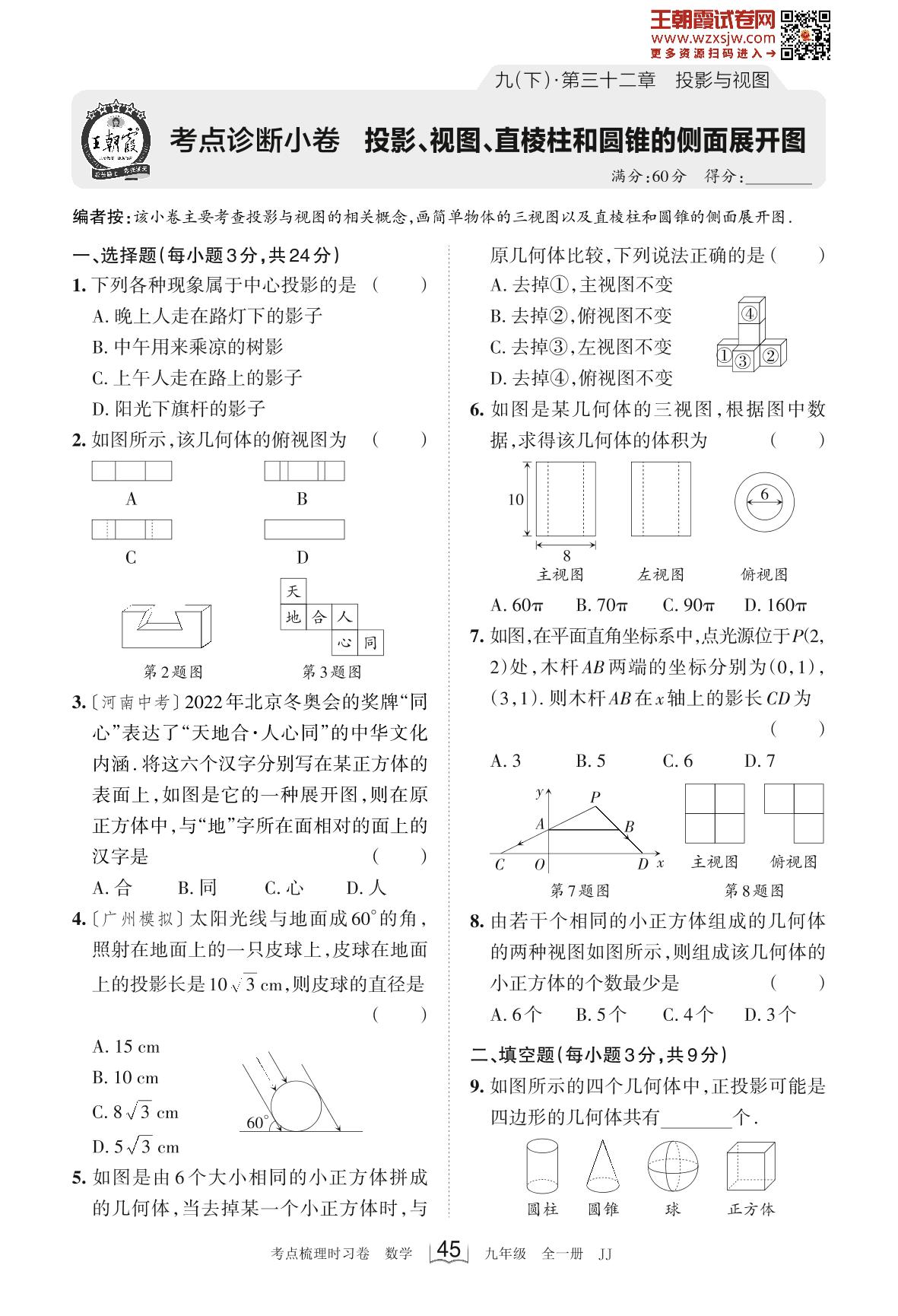 2024下册九年级数学冀教版 第三十二章 考点诊断小卷 投影、视图、直棱柱和圆锥的侧面展开图