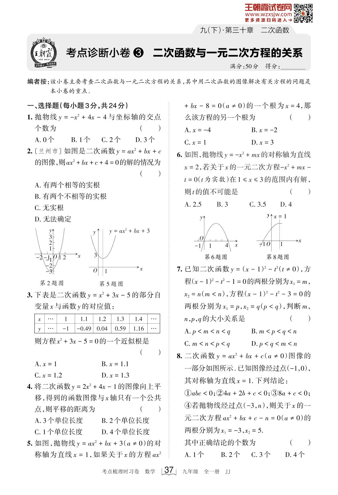 2024下册九年级数学冀教版 第三十章 考点诊断小卷3 二次函数与一元二次方程的关系