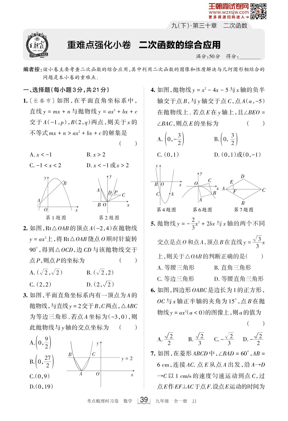2024下册九年级数学冀教版 第三十章 重难点强化小卷 二次函数的综合应用