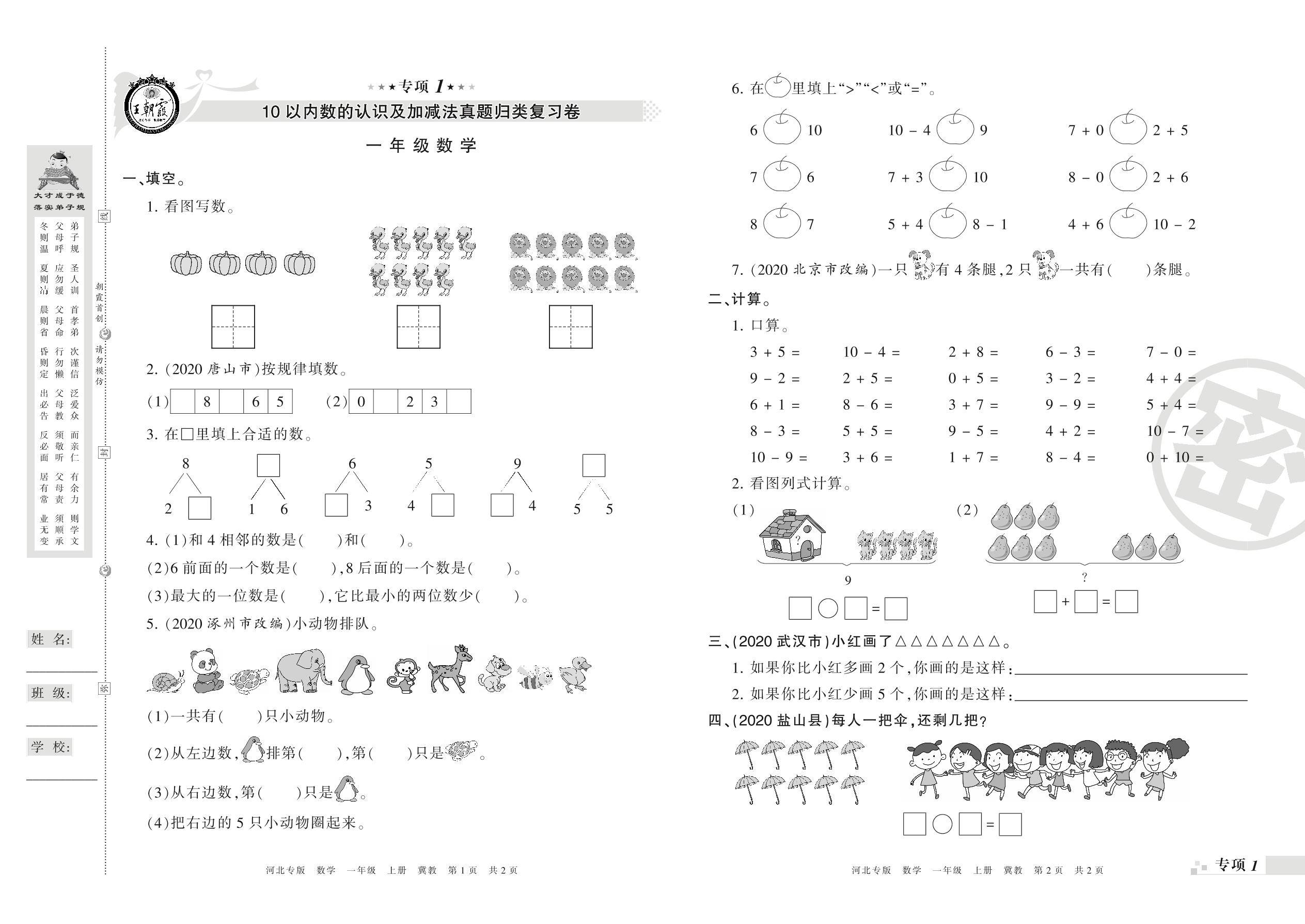 王朝霞期末专项卷——10以内数的认识及加减法、10~20各数的认识真题归类复习一年级上册数学(冀教版)【0】