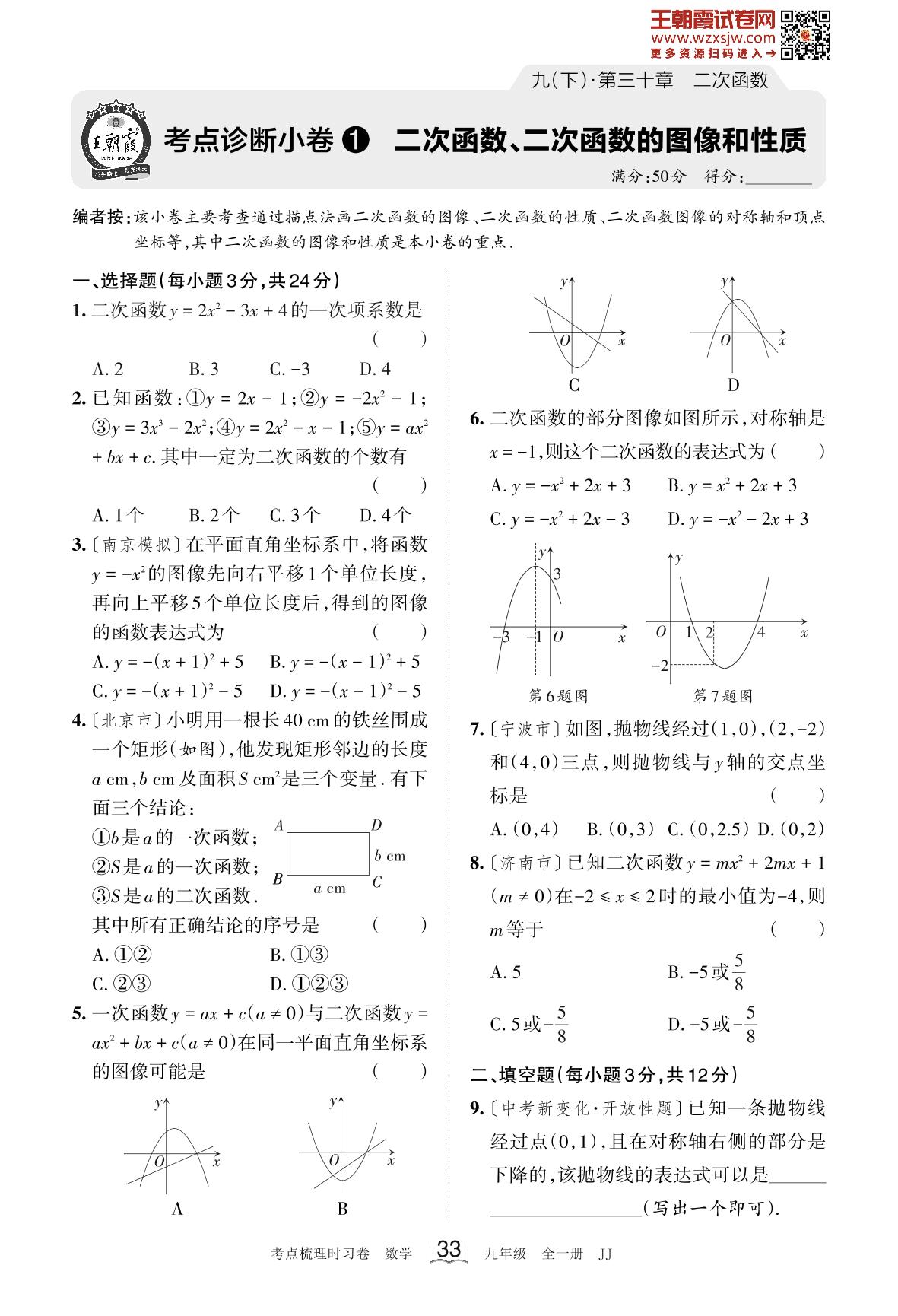 2024下册九年级数学冀教版 第三十章 考点诊断小卷1 二次函数、二次函数的图像和性质