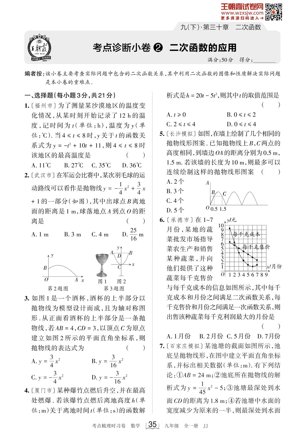 2024下册九年级数学冀教版 第三十章 考点诊断小卷2 二次函数的应用