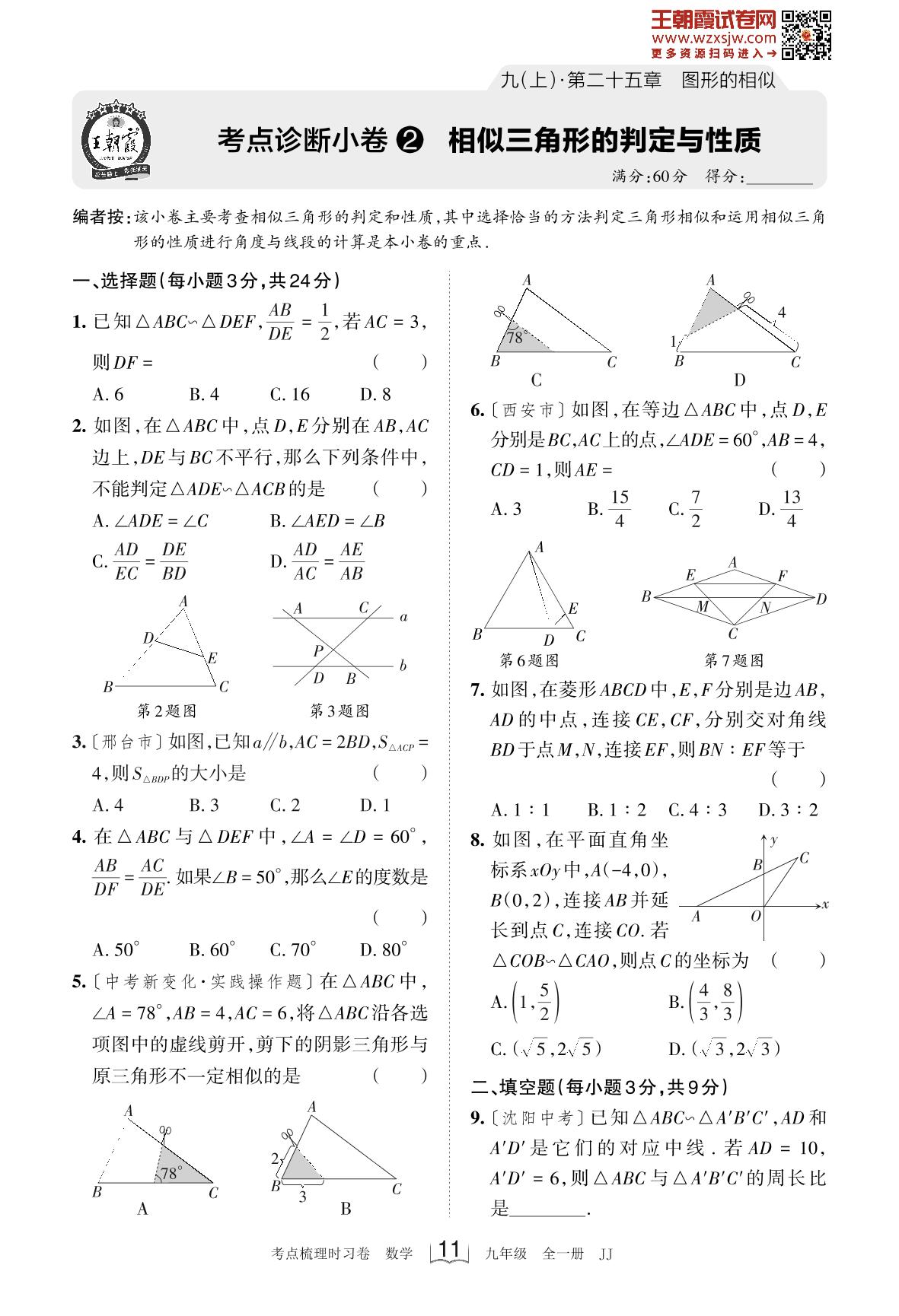 2023上册九年级数学冀教版 第二十五章 考点诊断小卷2 相似三角形的判定与性质