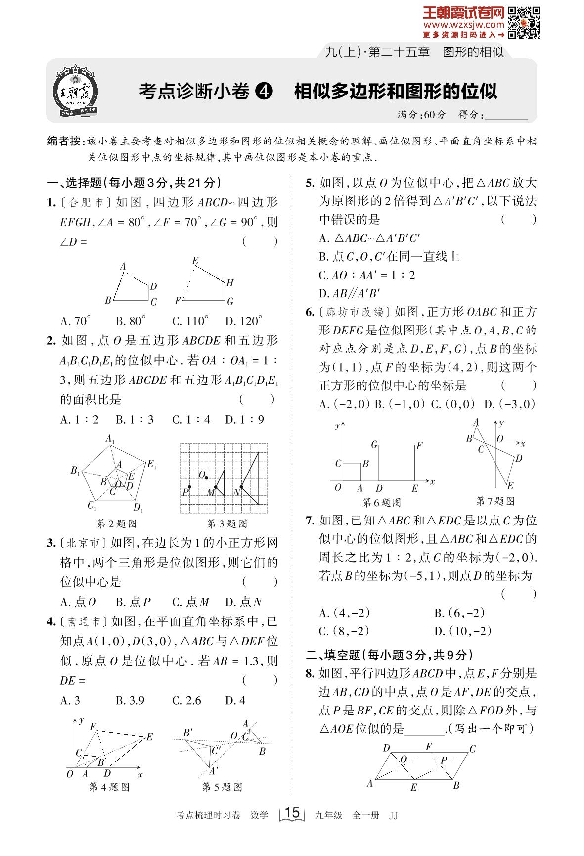 2023上册九年级数学冀教版 第二十五章 考点诊断小卷4 相似多边形和图形的位似