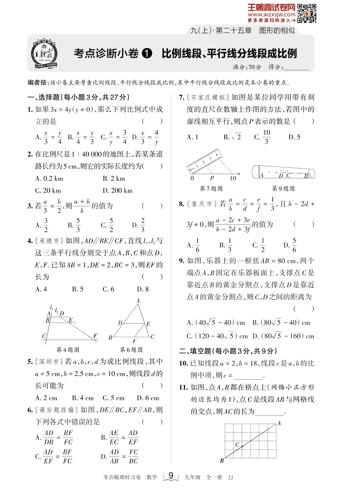2023上册九年级数学冀教版 第二十五章 考点诊断小卷1 比例线段、平行线分线段成比例