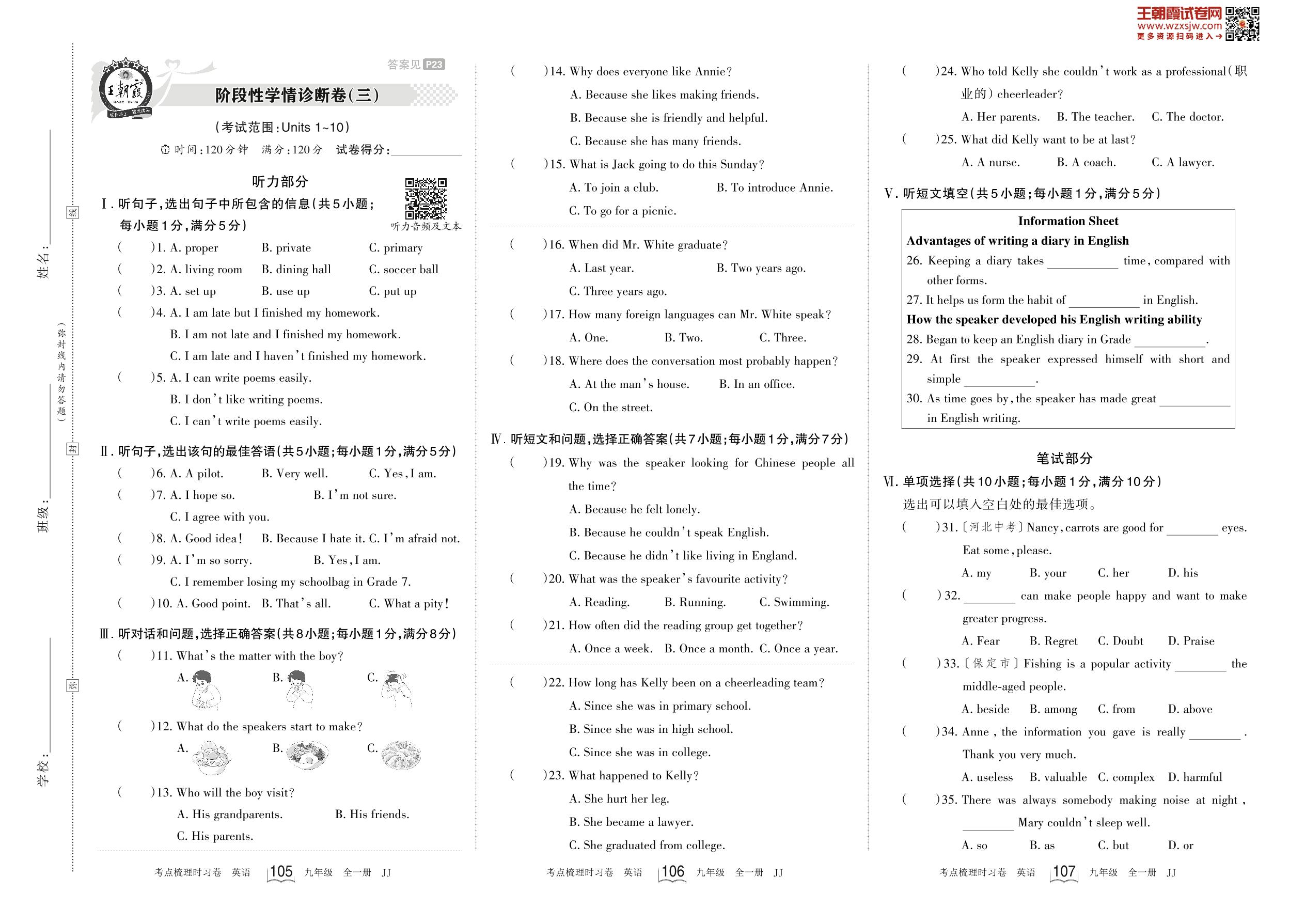 2023-2024学年九年级英语冀教版 阶段性学情诊断卷(三)