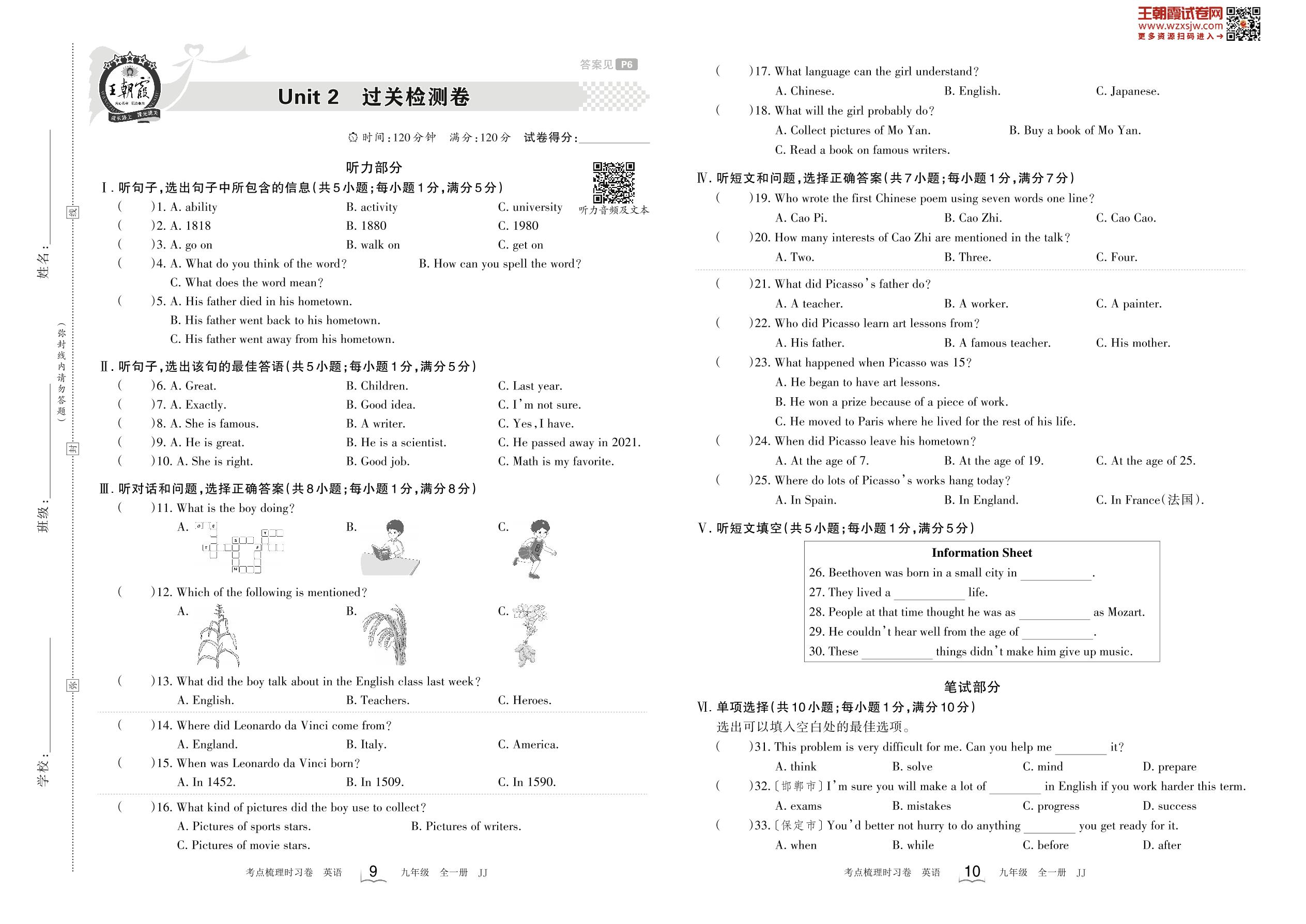 2023-2024学年九年级英语冀教版 Unit 2 过关检测卷