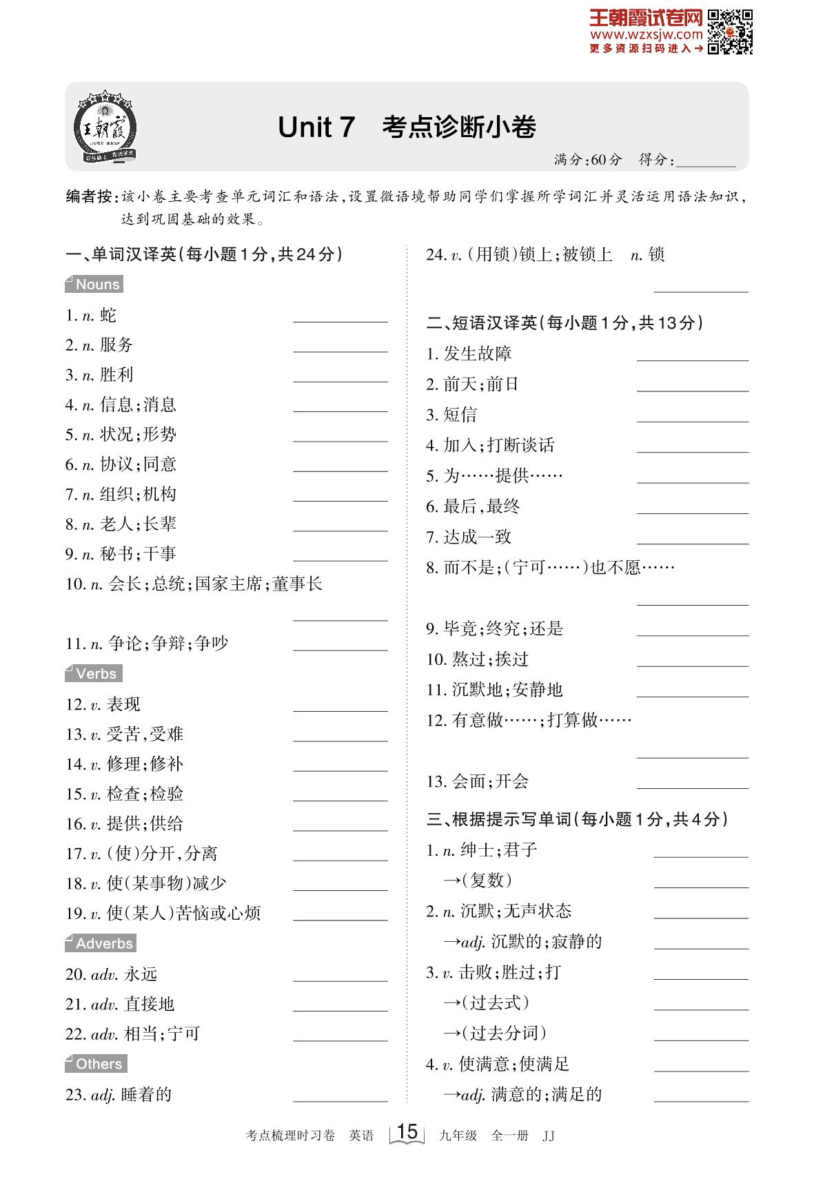 2023-2024学年九年级英语冀教版 Unit 7 考点诊断小卷