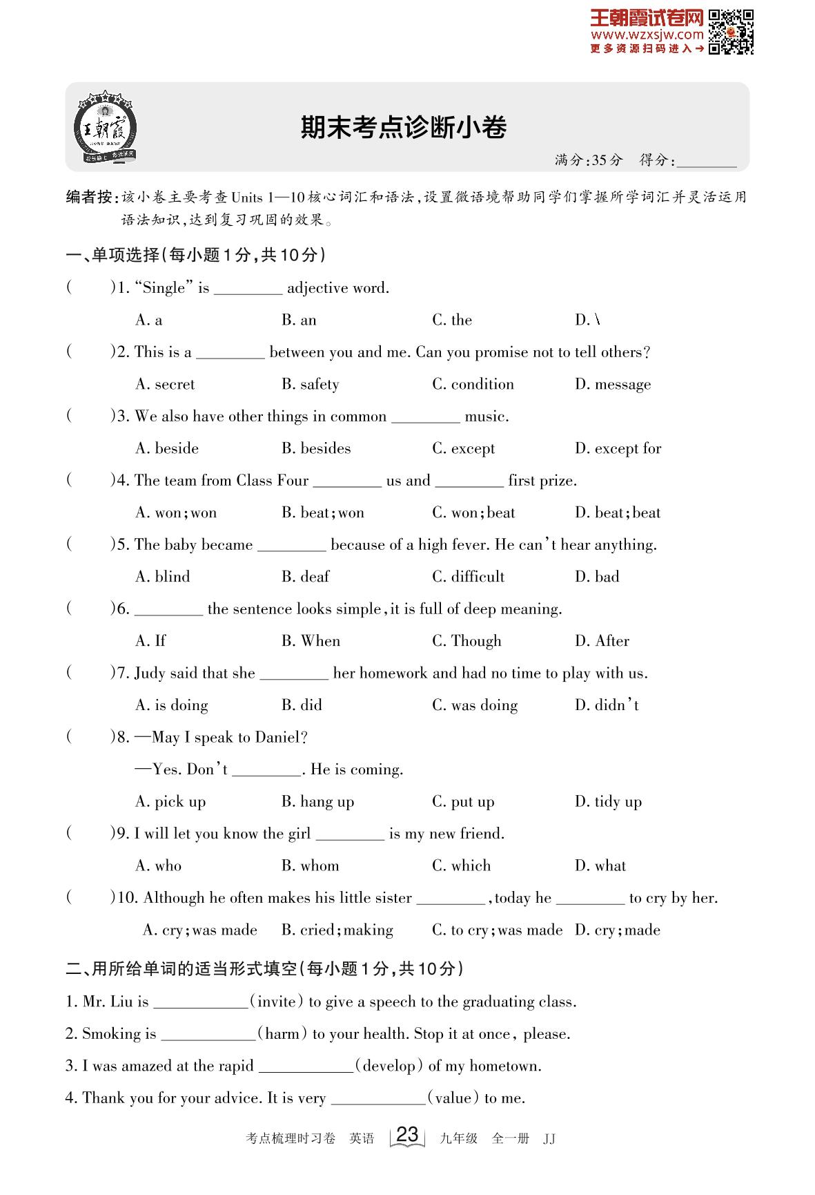 2023-2024学年九年级英语冀教版 期末考点诊断小卷