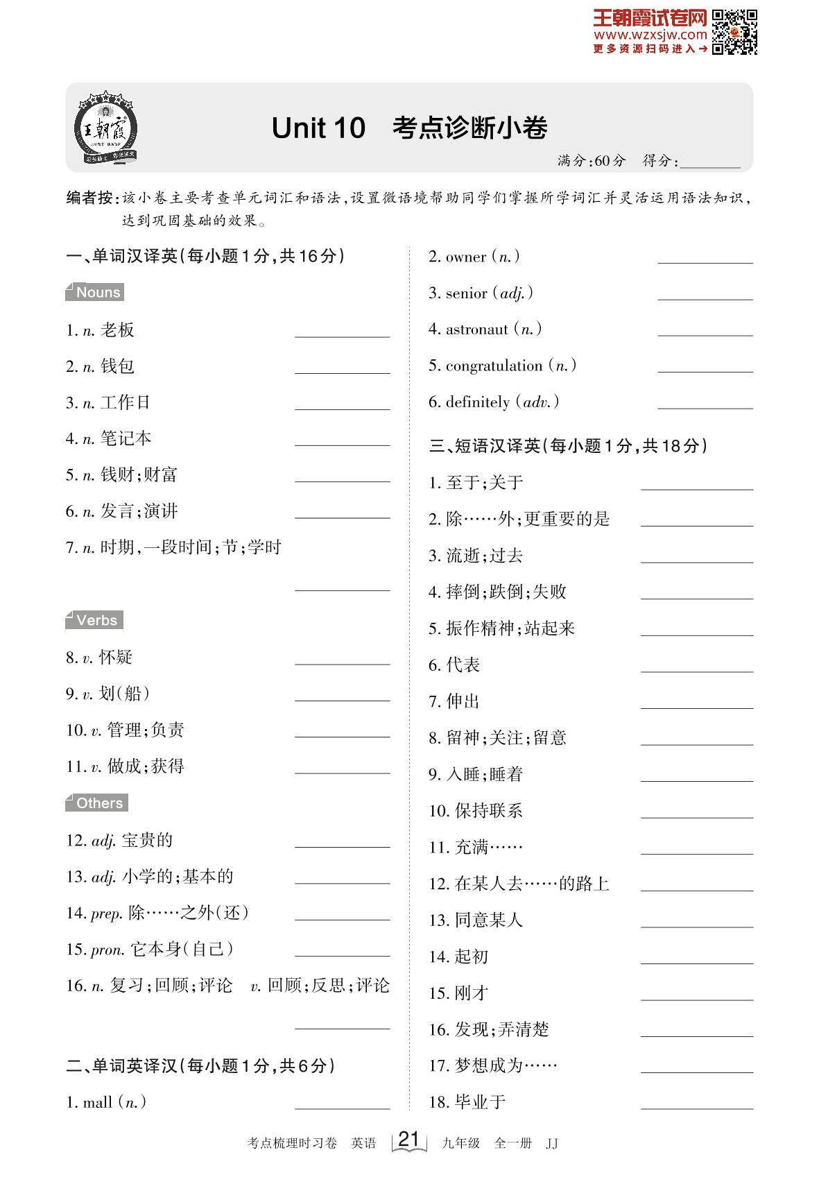 2023-2024学年九年级英语冀教版 Unit 10 考点诊断小卷