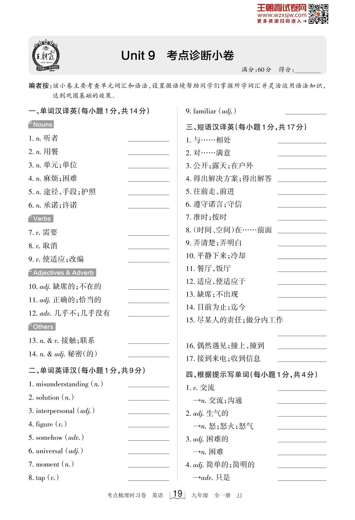 2023-2024学年九年级英语冀教版 Unit 9 考点诊断小卷