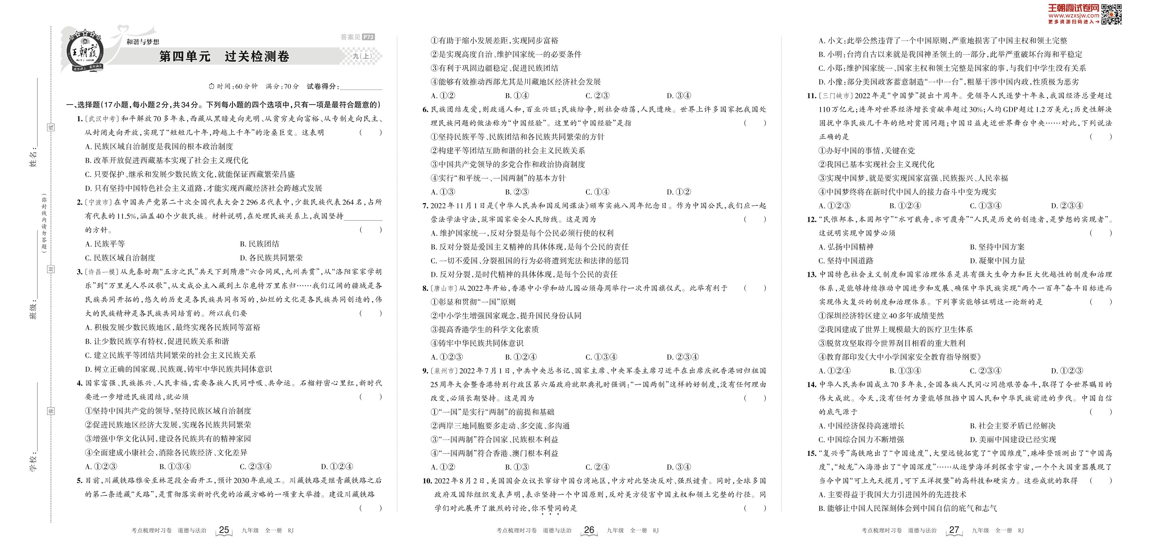 九年级道德与法治人教版上册单元卷