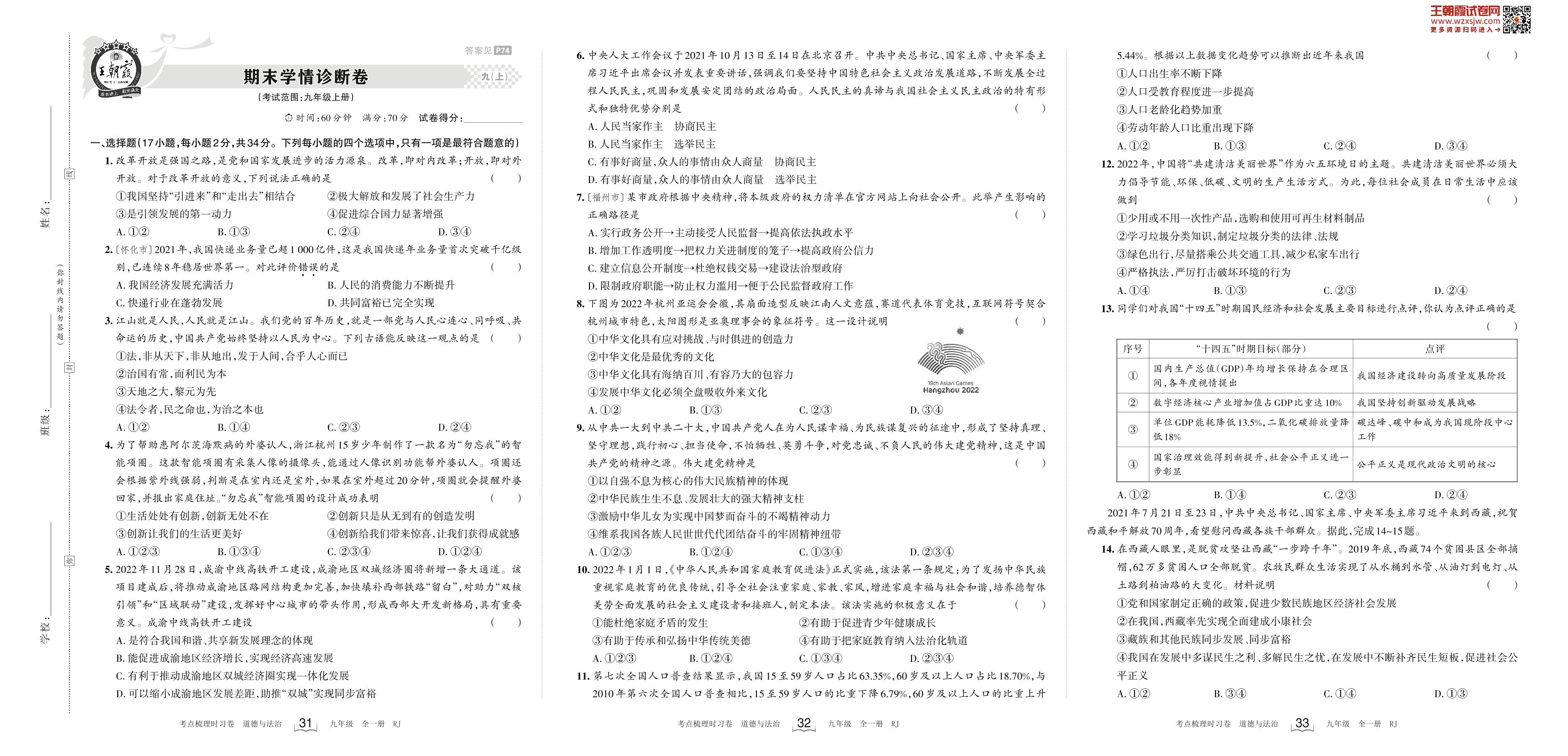 2023上册九年级道德与法治人教版 期末学情诊断卷(2月版)