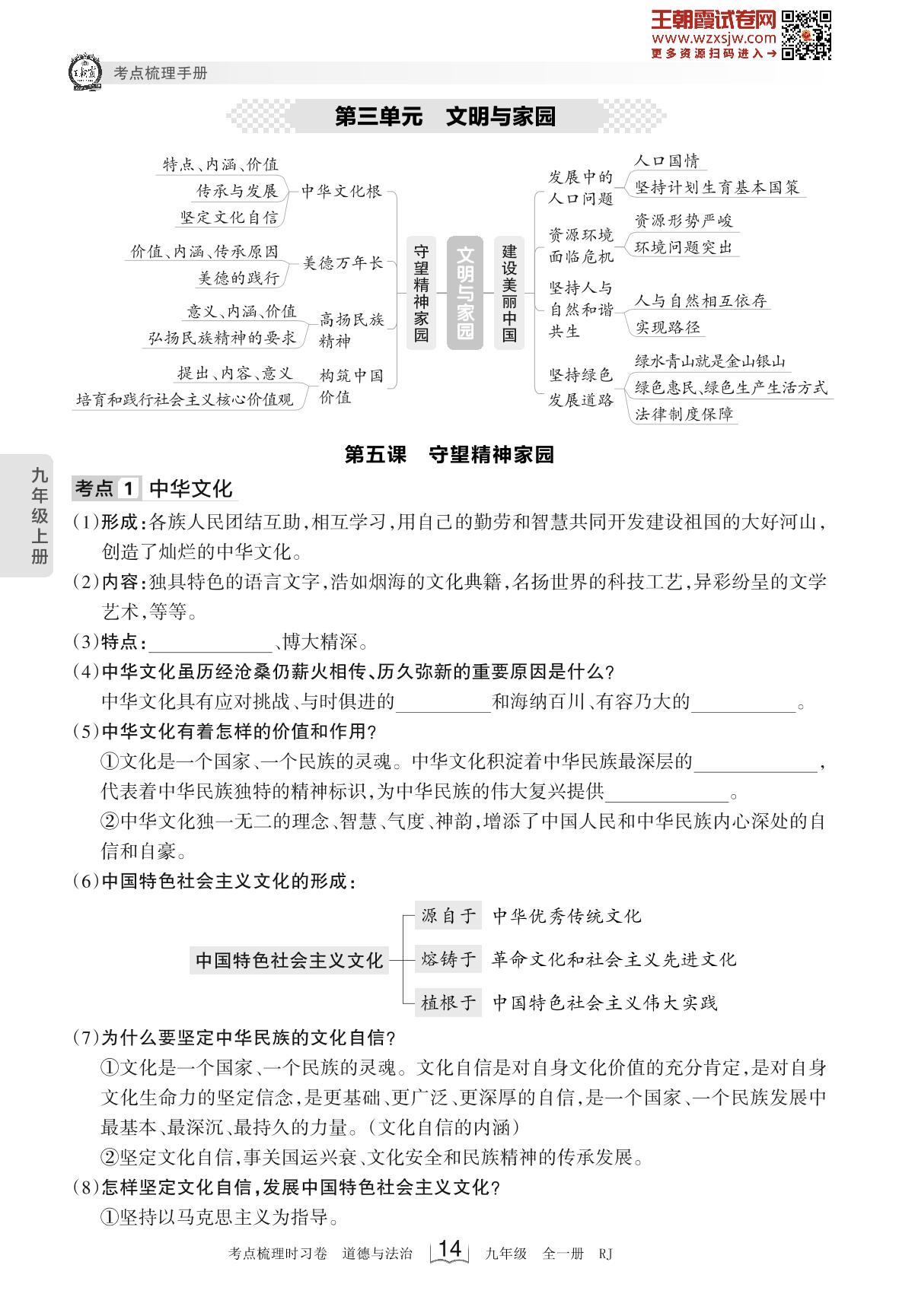 2023上册九年级道德与法治人教版 考点梳理手册——第三单元 文明与家园(2月版)