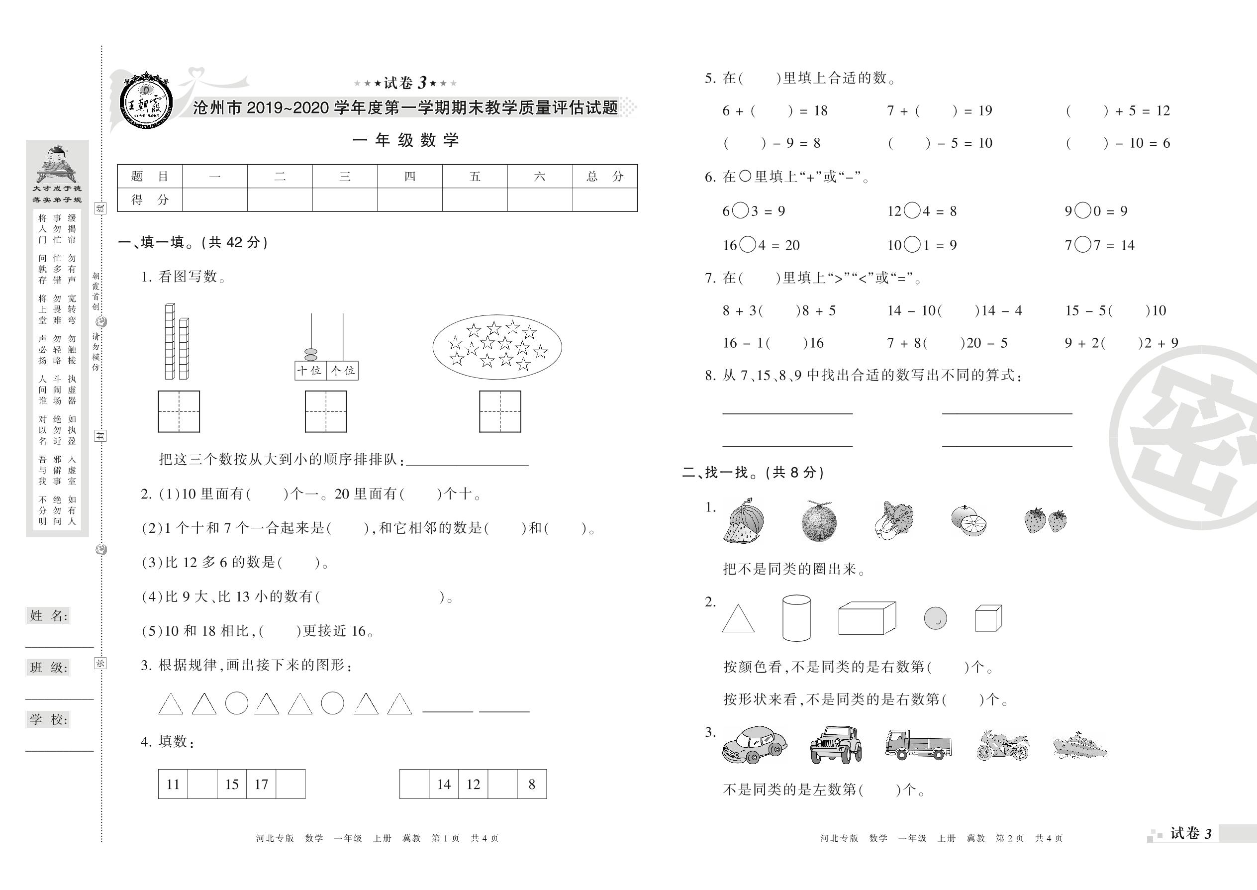 2019-2020学年第一学期沧州市一年级数学试卷(冀教版)【3】