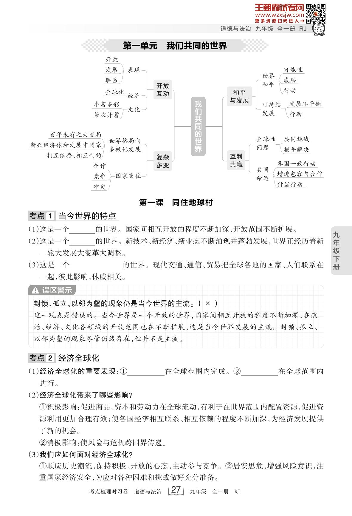 2024下册九年级道德与法治人教版 考点梳理手册——第一单元 我们共同的世界(2月版)