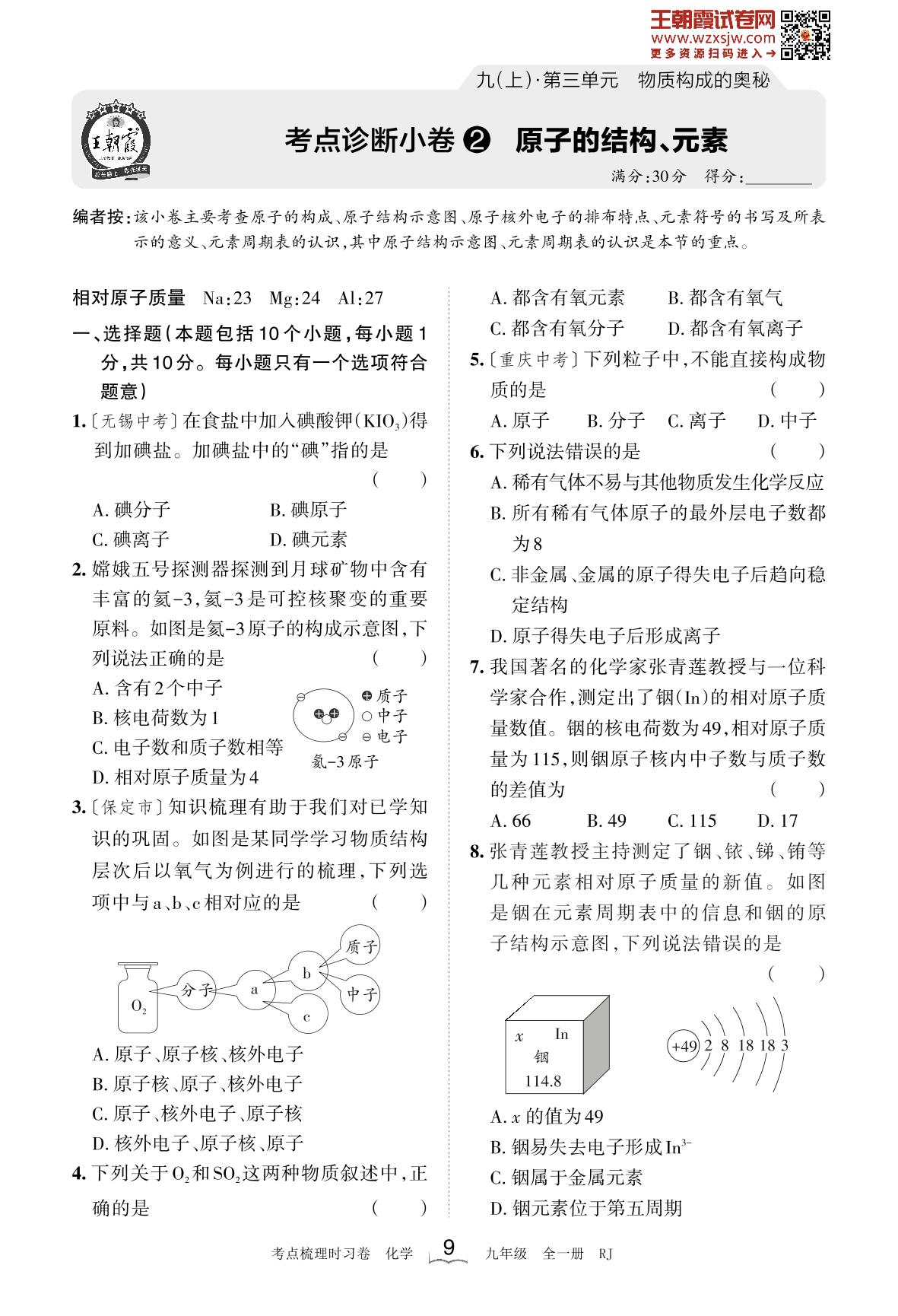 2023上册九年级化学人教版 第三单元 考点诊断小卷2 原子的结构、元素