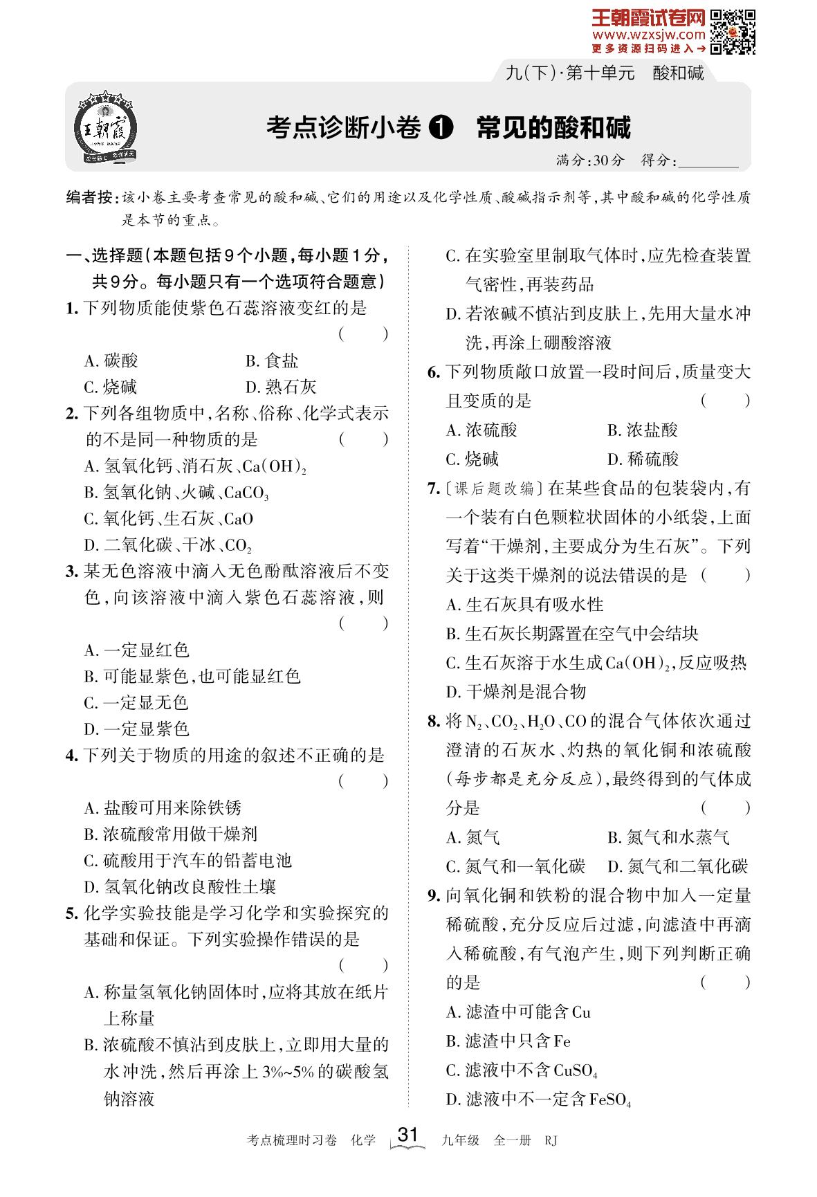 2024下册九年级化学人教版 第十单元 考点诊断小卷1 常见的酸和碱