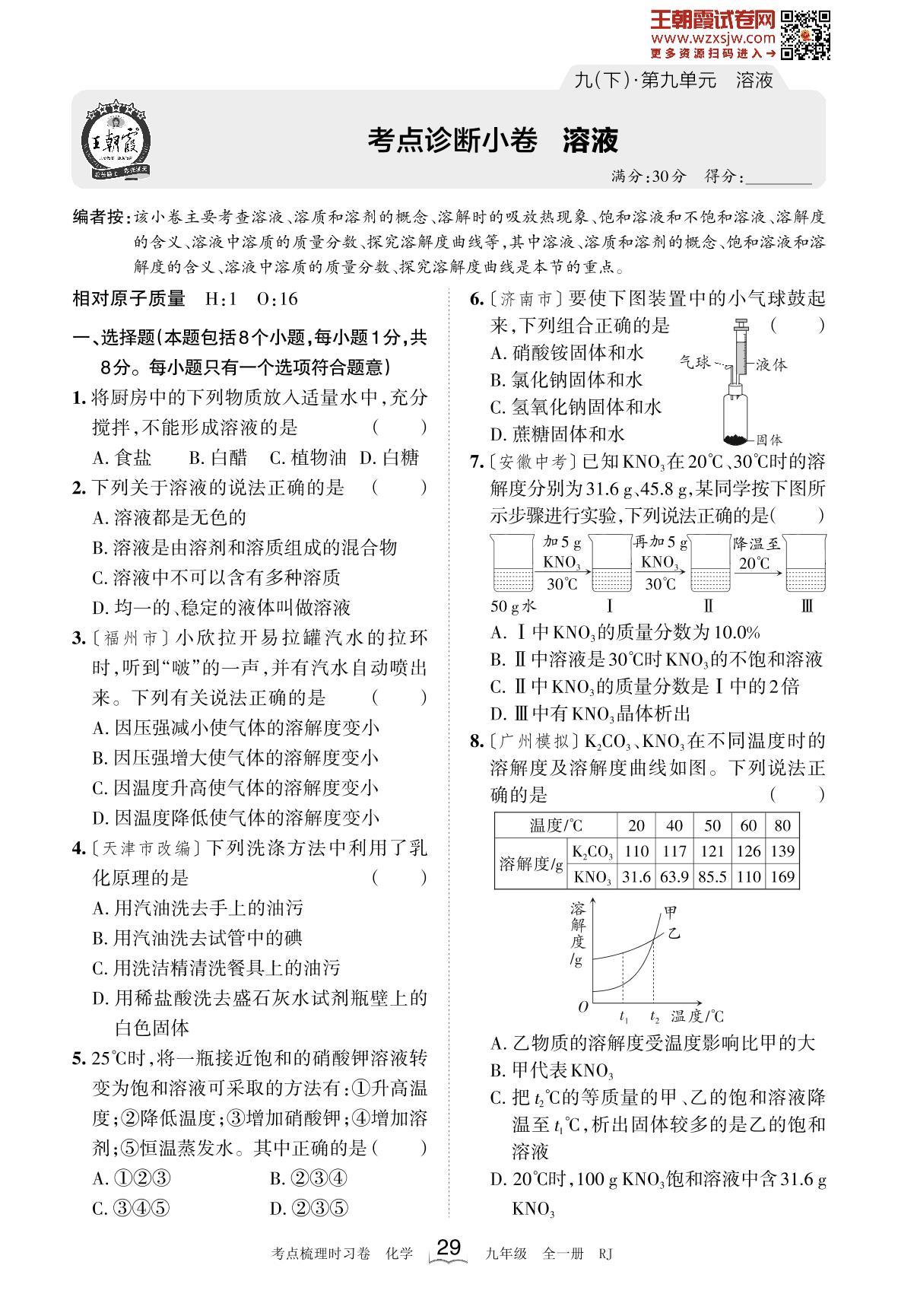 2024下册九年级化学人教版 第九单元 考点诊断小卷 溶液