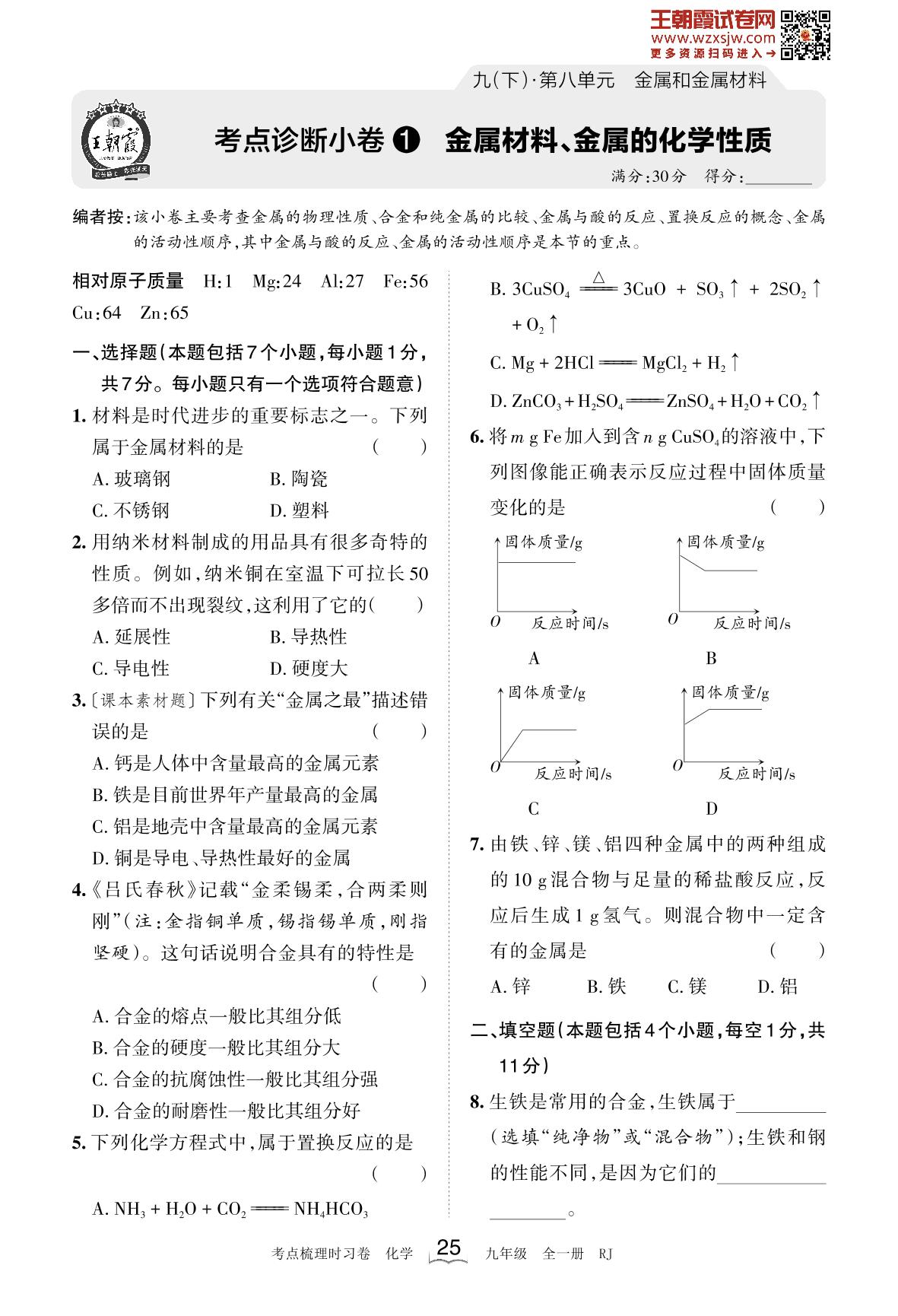 2024下册九年级化学人教版 第八单元 考点诊断小卷1 金属材料、金属的化学性质