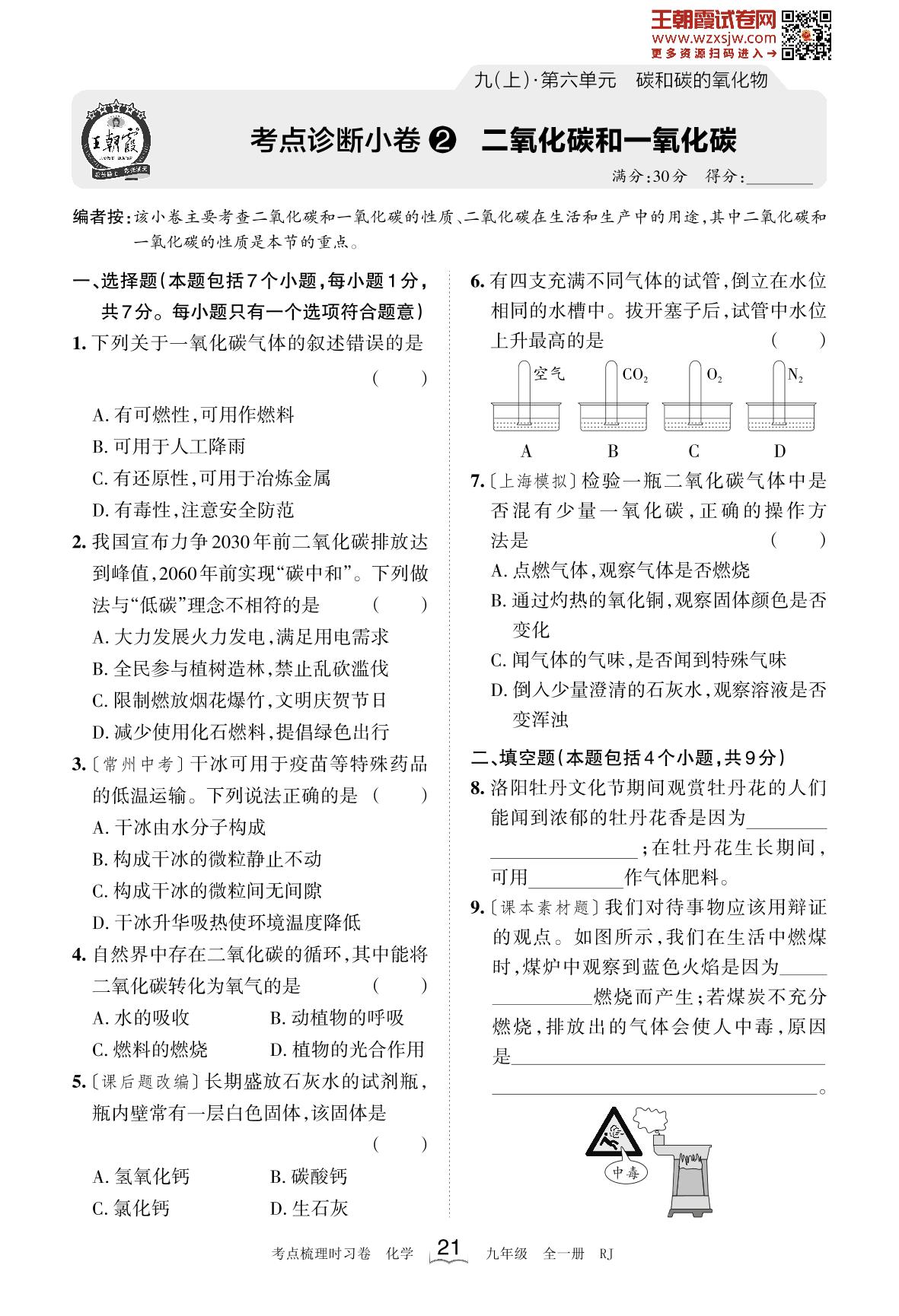 2023上册九年级化学人教版 第六单元 考点诊断小卷2 二氧化碳和一氧化碳