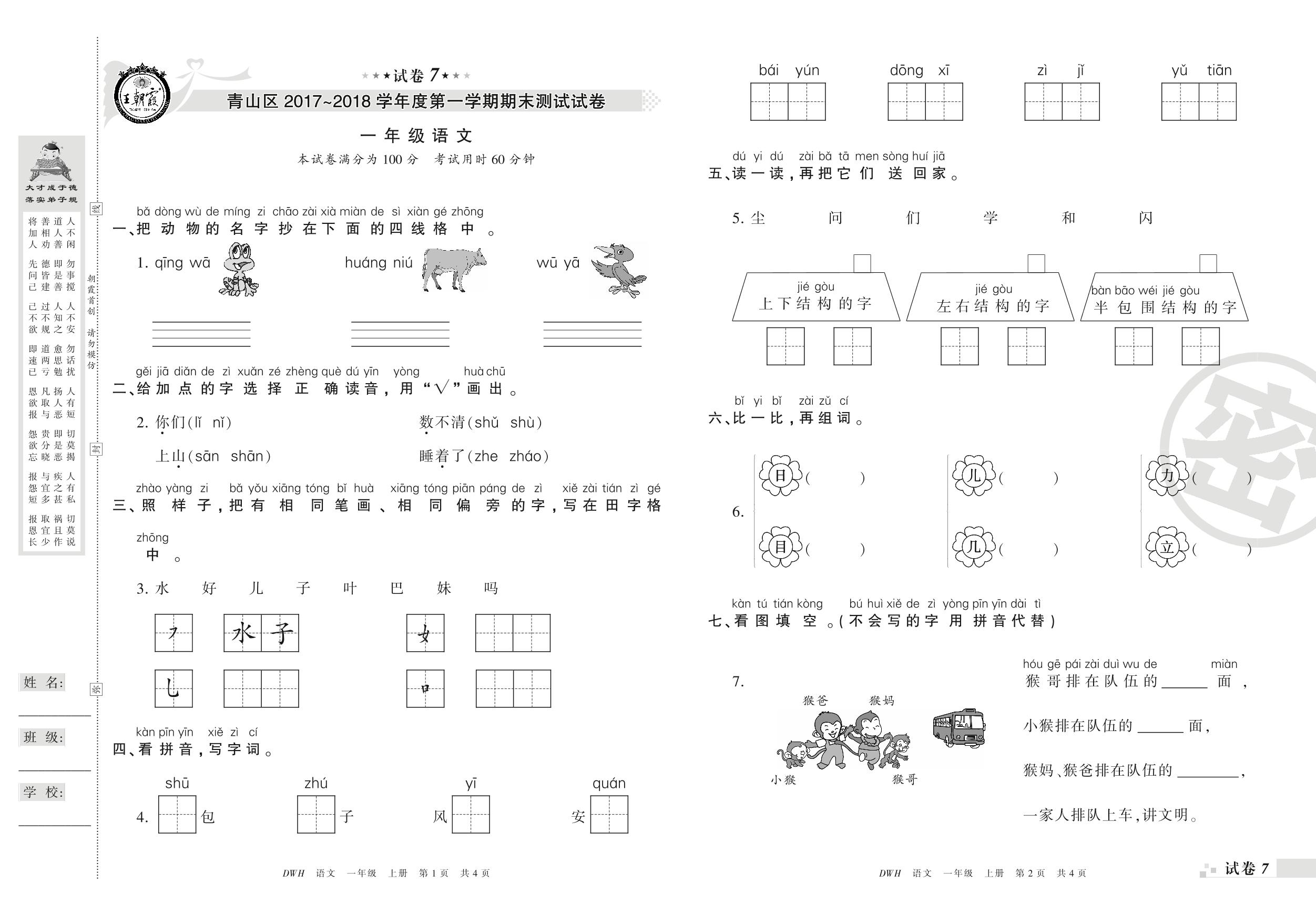 2017-2018学年第一学期武汉市青山区一年级语文试卷(人教版)【7】