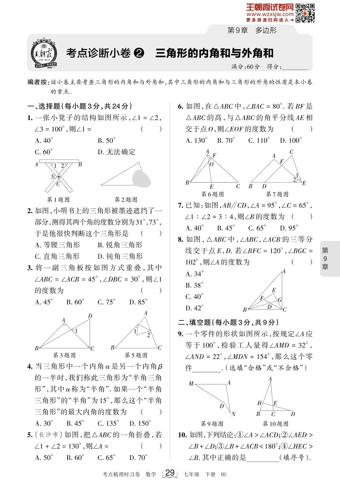 2023下册七年级数学华师版 第9章 考点诊断小卷2 三角形的内角和与外角和