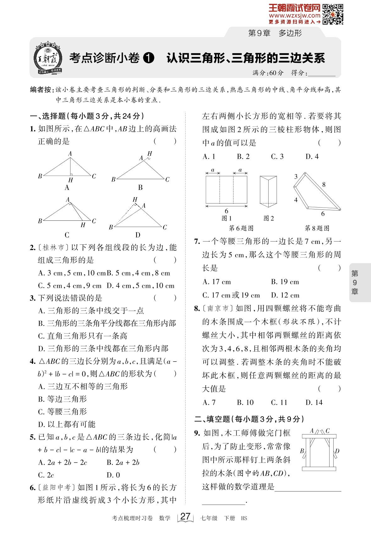 2023下册七年级数学华师版 第9章 考点诊断小卷1 认识三角形、三角形的三边关系