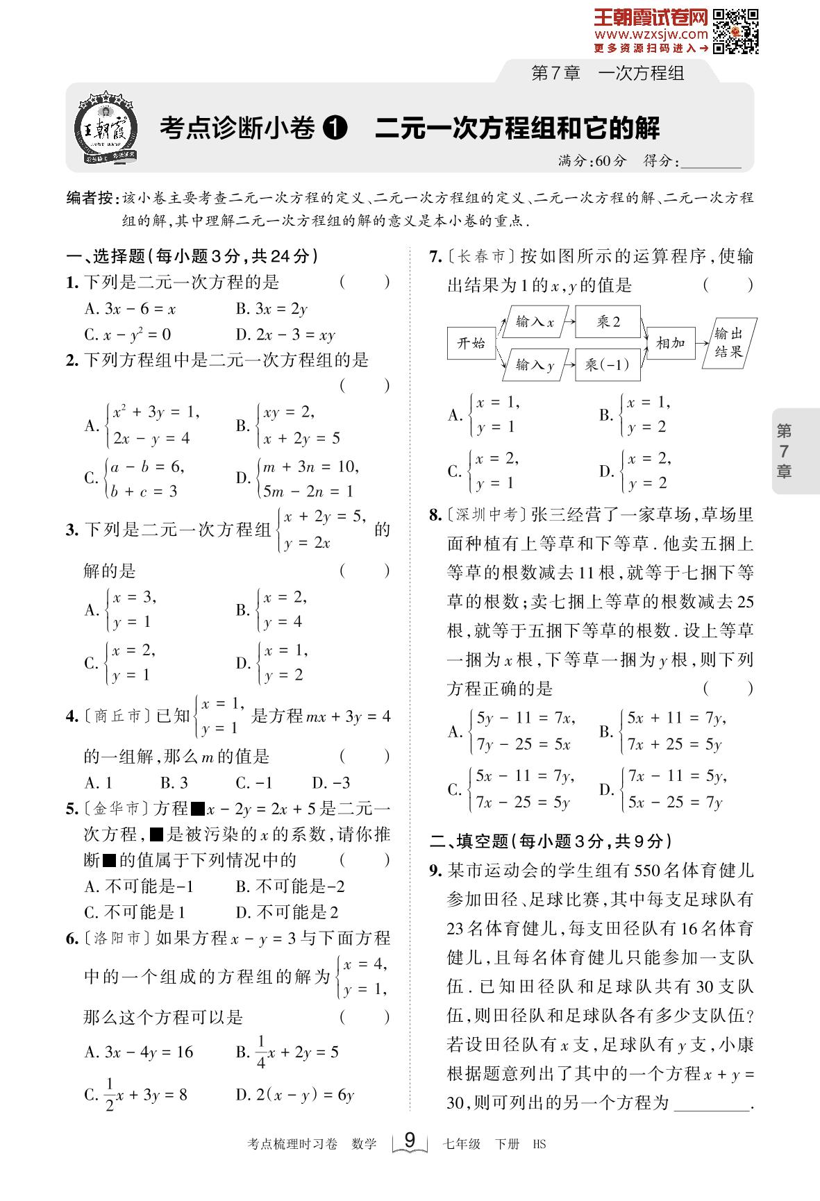 2023下册七年级数学华师版 第7章 考点诊断小卷1 二元一次方程组和它的解