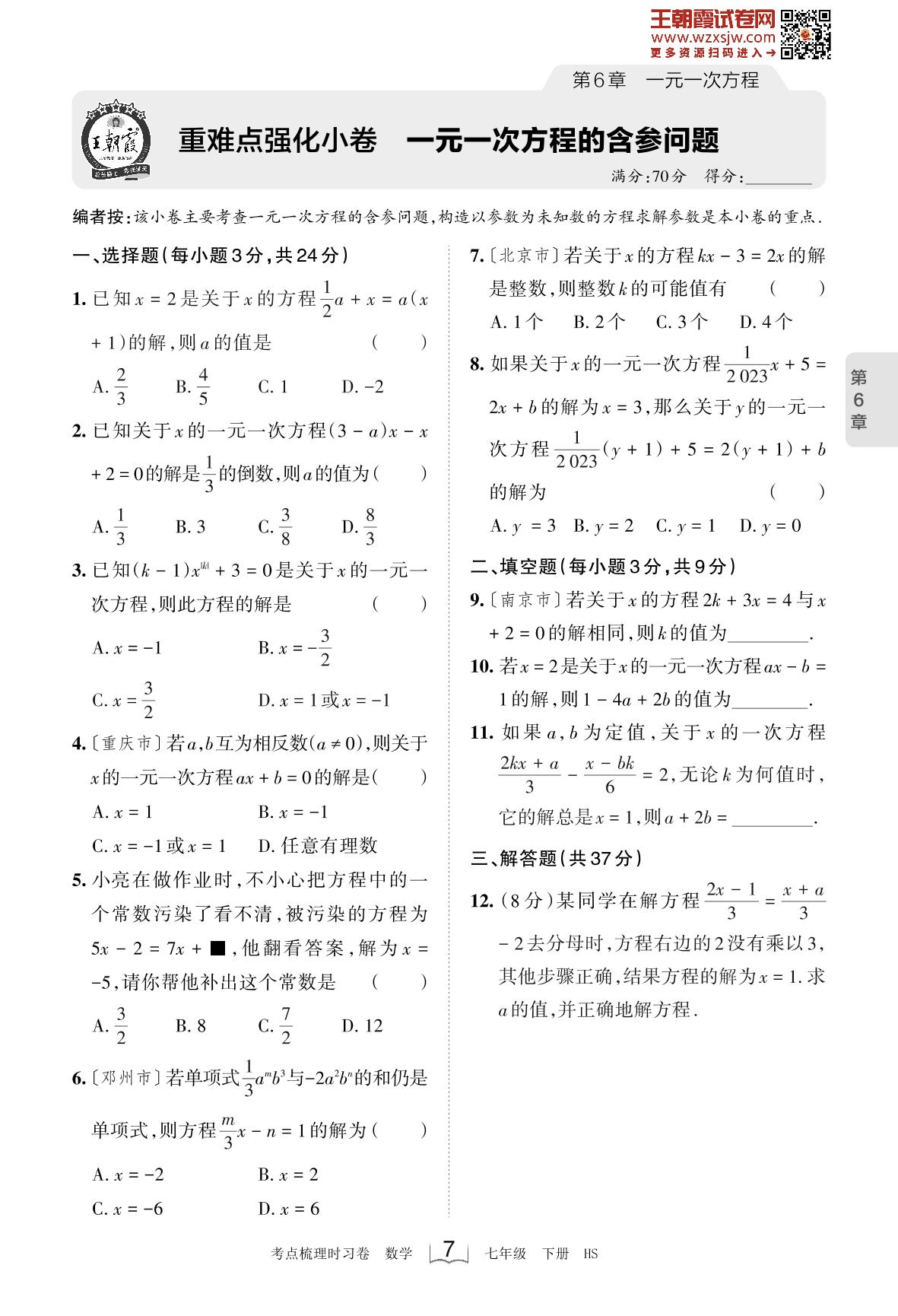 2023下册七年级数学华师版 第6章 重难点强化小卷 一元一次方程的含参问题