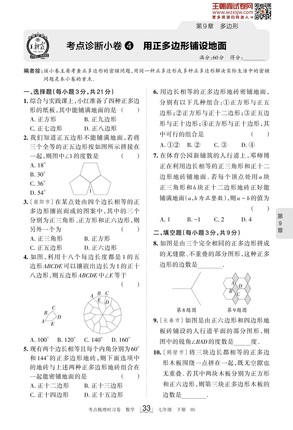 2023下册七年级数学华师版 第9章 考点诊断小卷4 用正多边形铺设地面