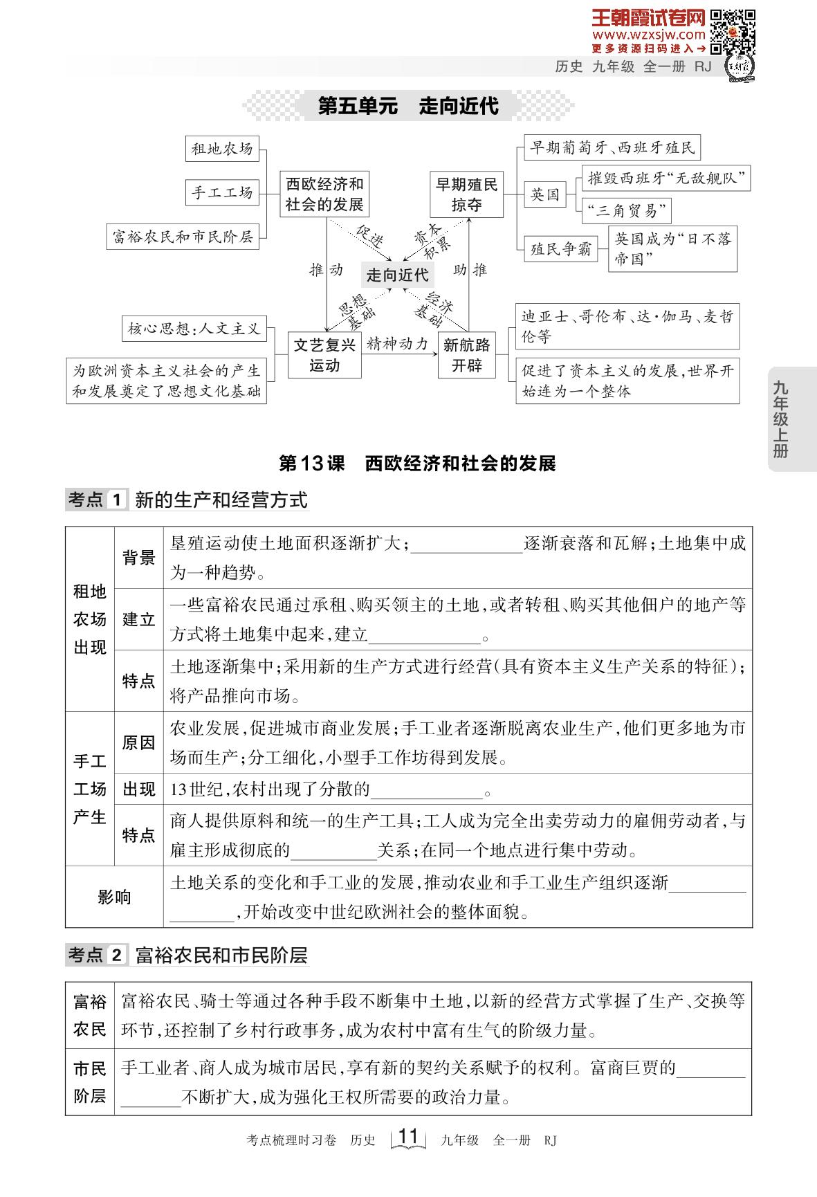 2023上册九年级历史人教版 考点梳理手册——第五单元 走向近代