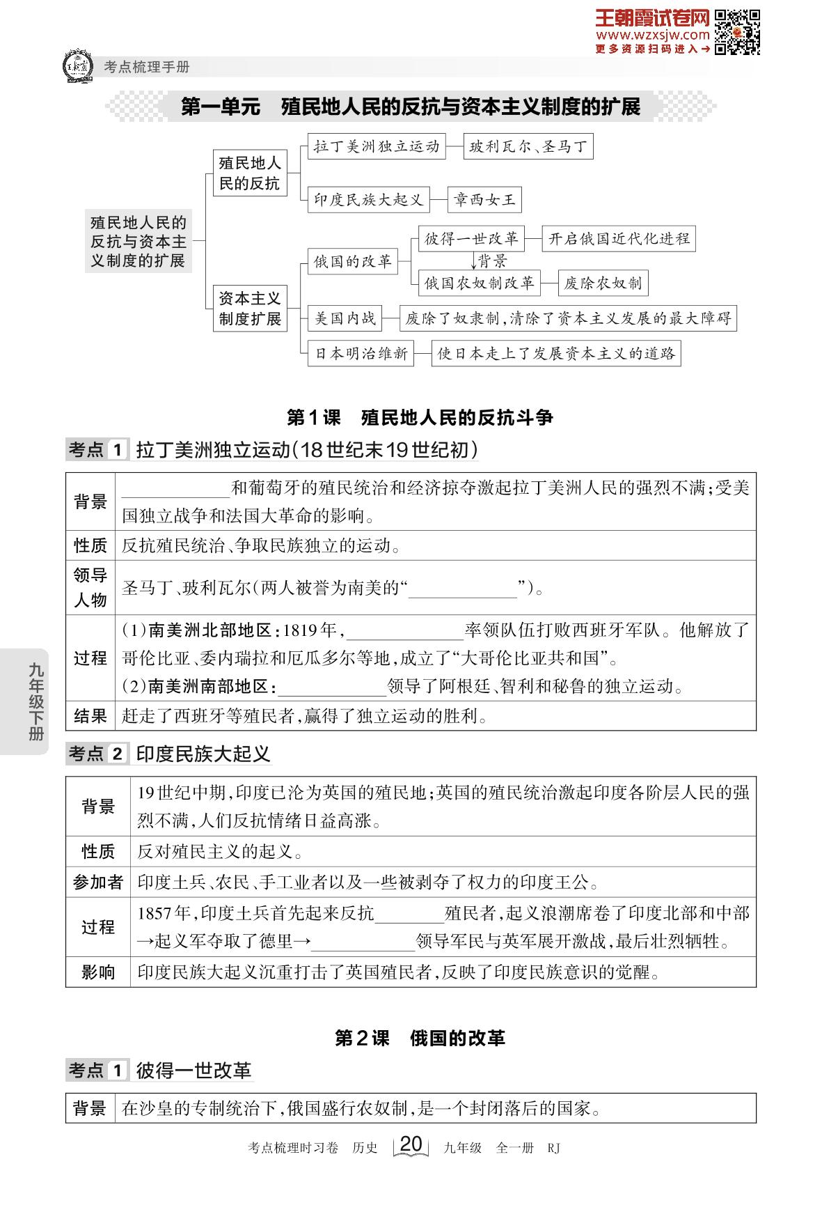 2024下册九年级历史人教版 考点梳理手册——第一单元 殖民地人民的反抗与资本主义制度的扩