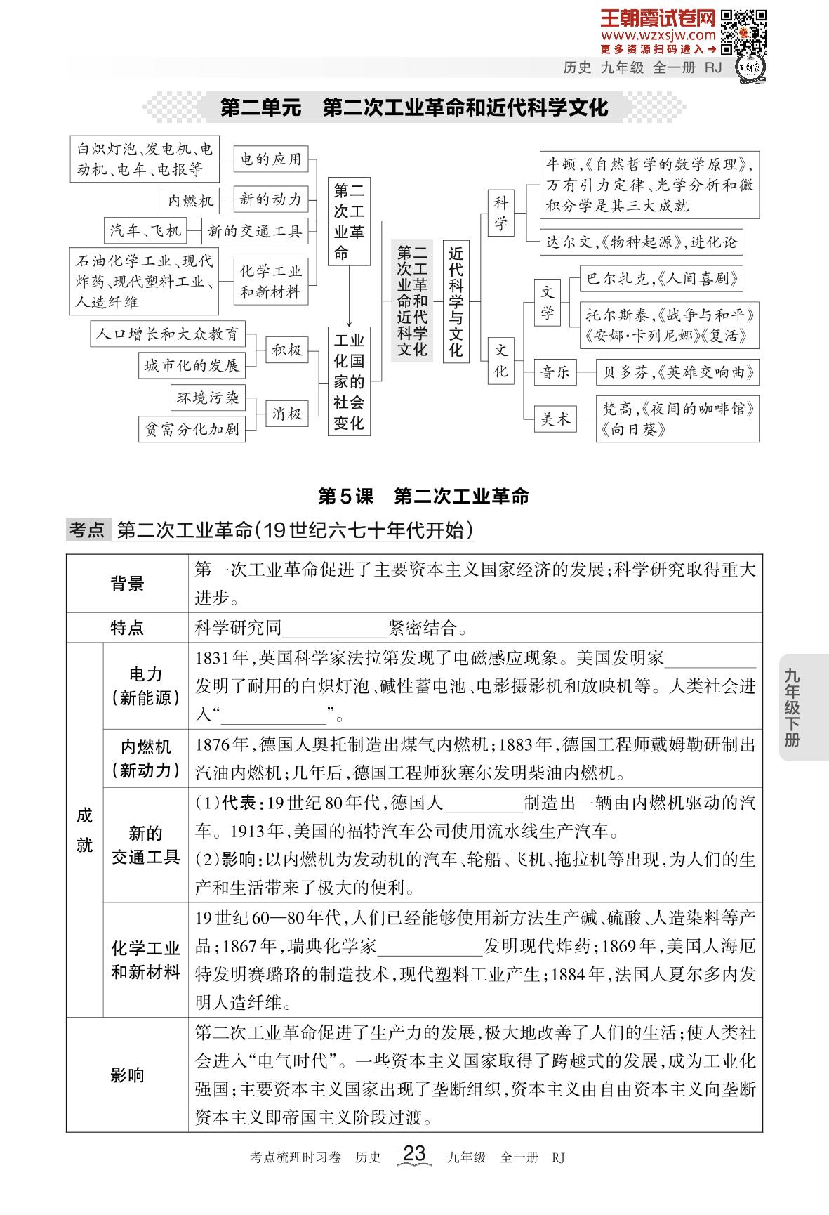2024下册九年级历史人教版 考点梳理手册——第二单元 第二次工业革命和近代科学文化