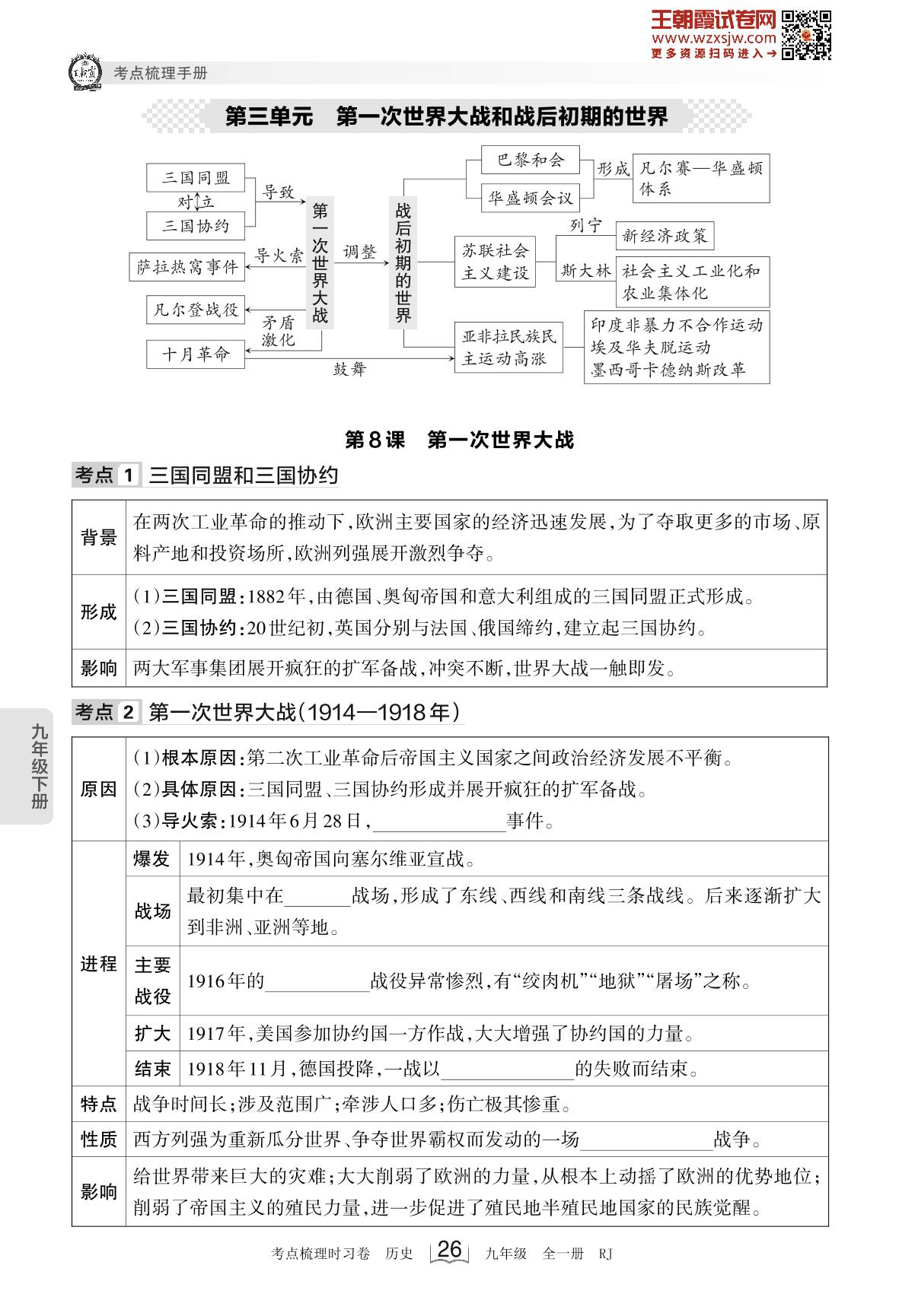 2024下册九年级历史人教版 考点梳理手册——第三单元 第一次世界大战和战后初期的世界