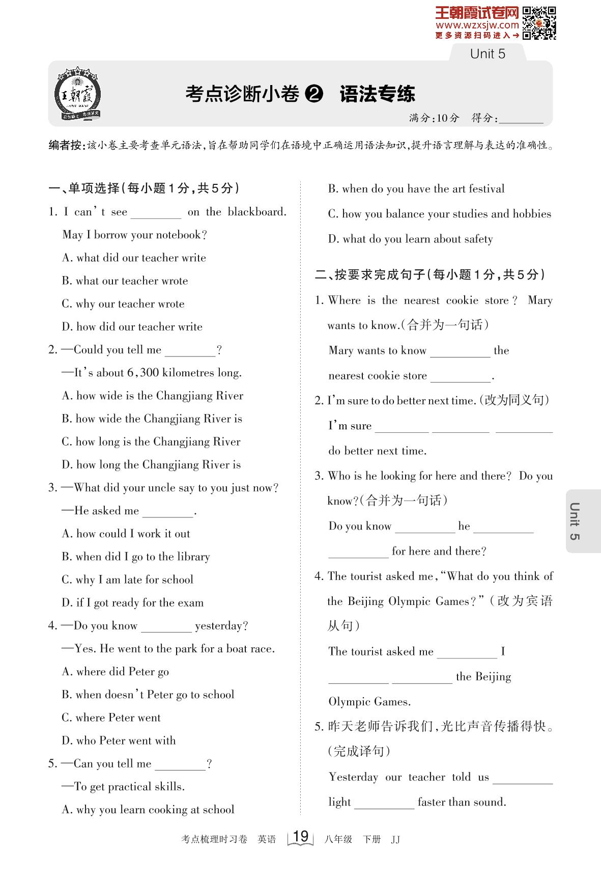 2023下册八年级英语冀教版 Unit 5 考点诊断小卷2 语法专练