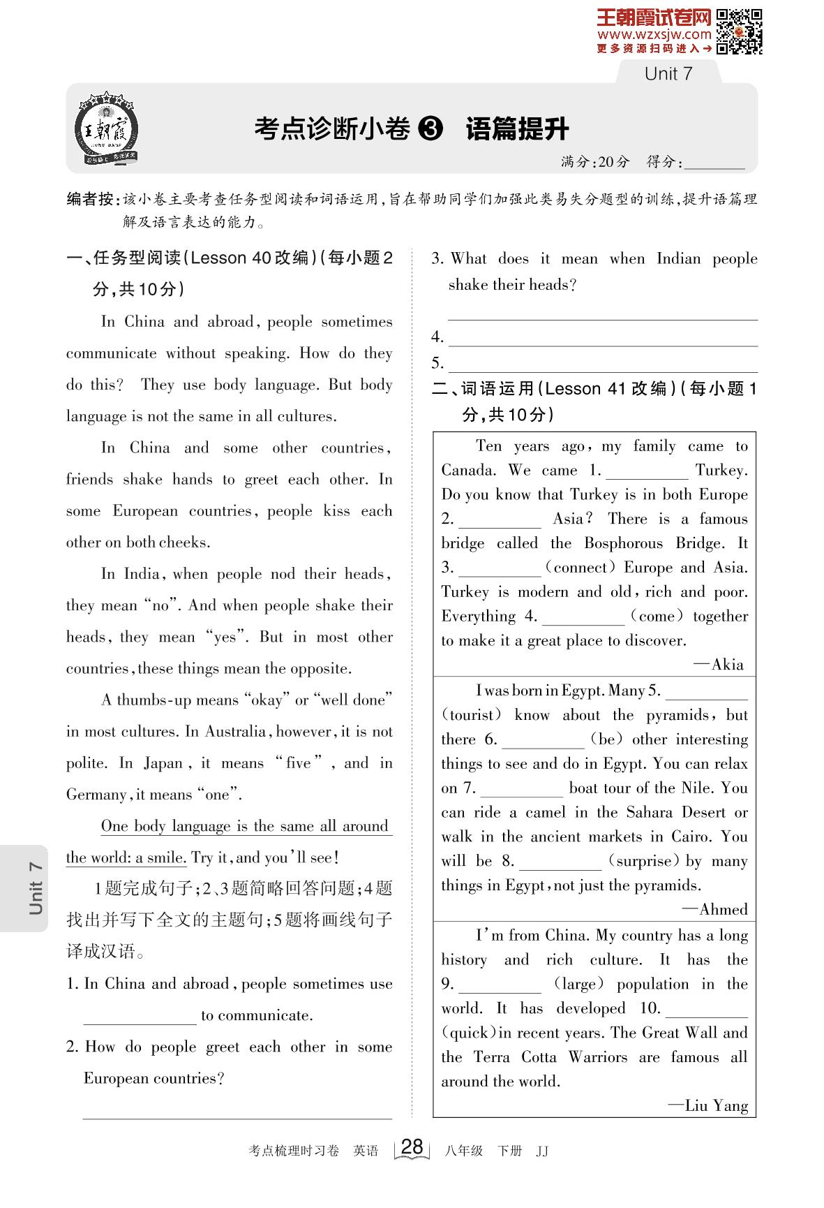 2023下册八年级英语冀教版 Unit 7 考点诊断小卷3 语篇提升