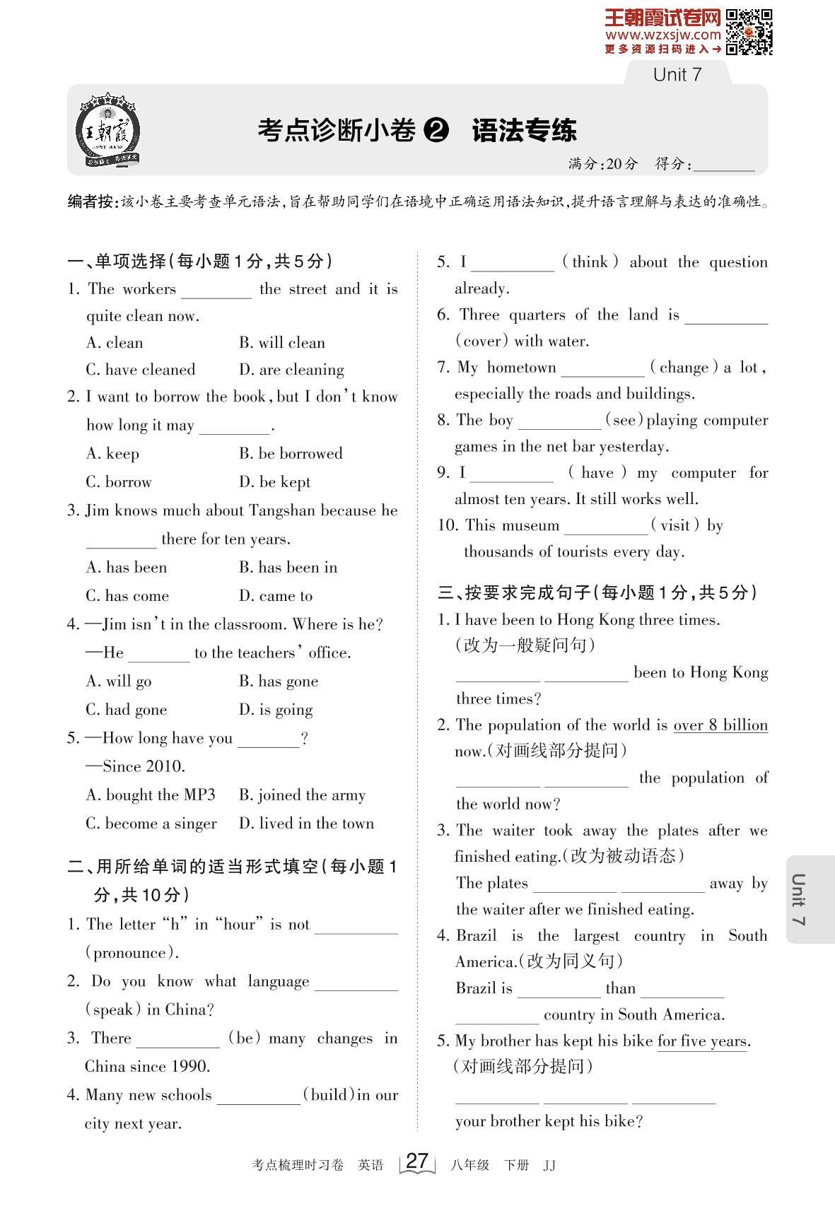 2023下册八年级英语冀教版 Unit 7 考点诊断小卷2 语法专练