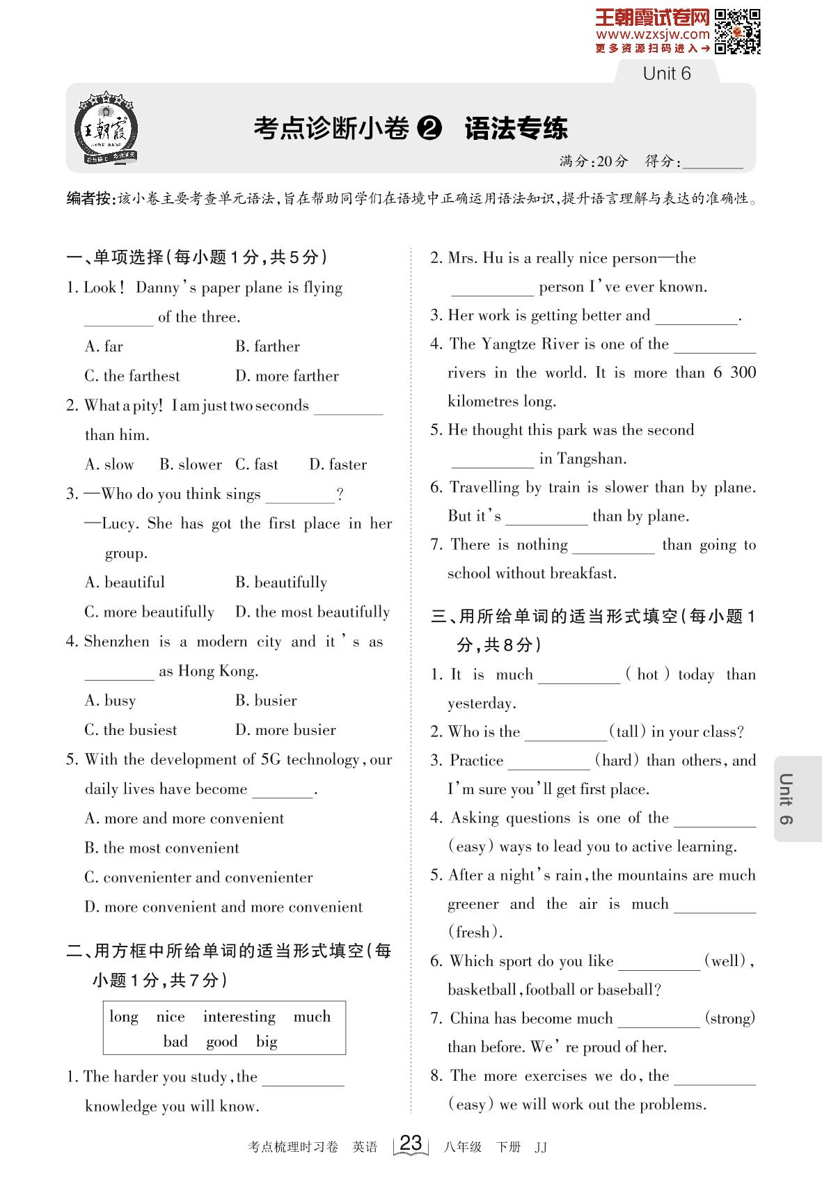 2023下册八年级英语冀教版 Unit 6 考点诊断小卷2 语法专练