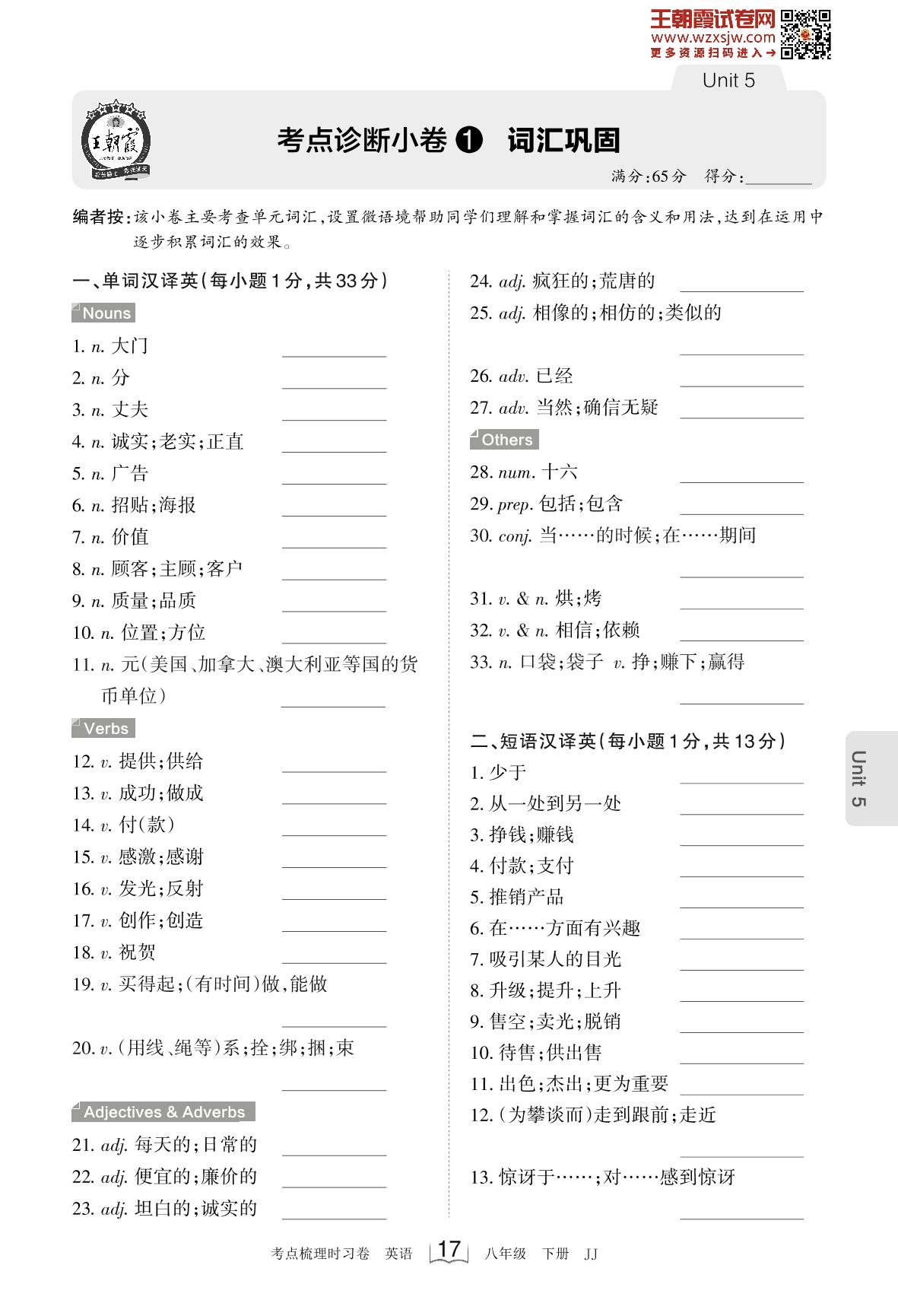 2023下册八年级英语冀教版 Unit 5 考点诊断小卷1 词汇巩固