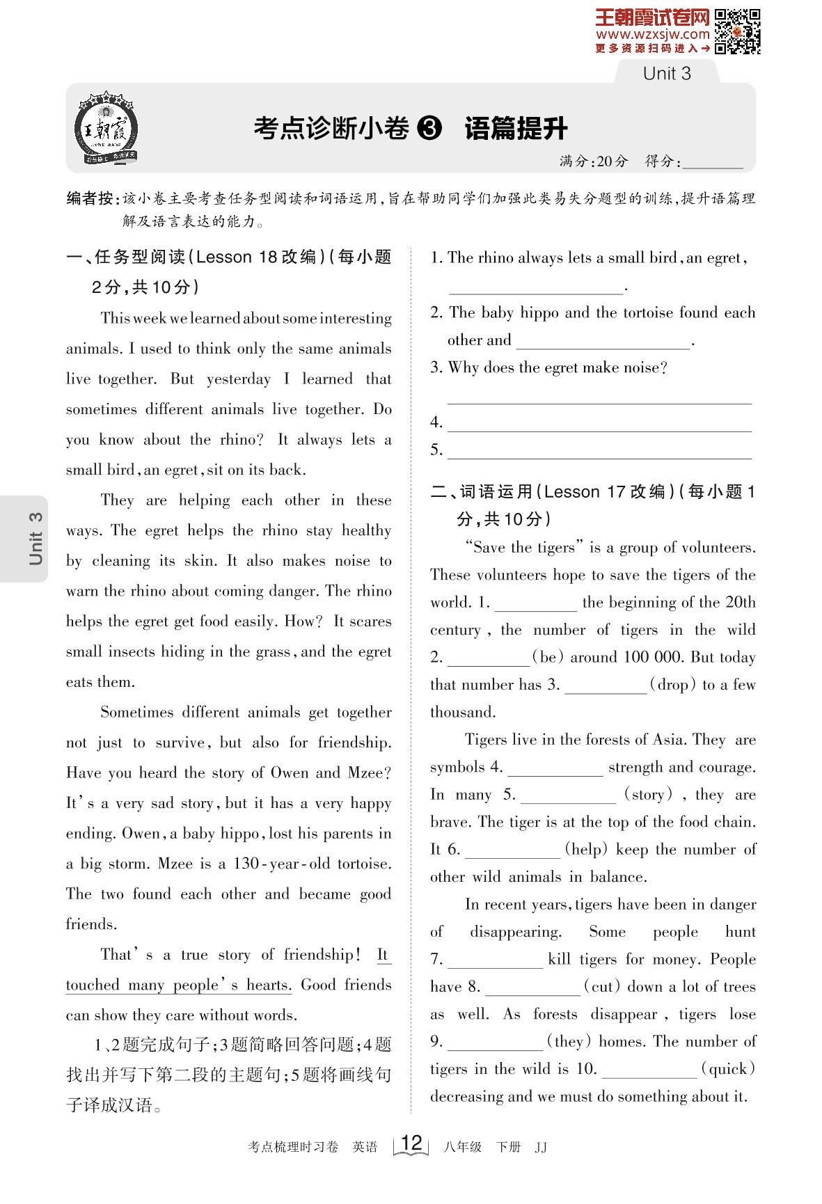 2023下册八年级英语冀教版 Unit 3 考点诊断小卷3 语篇提升