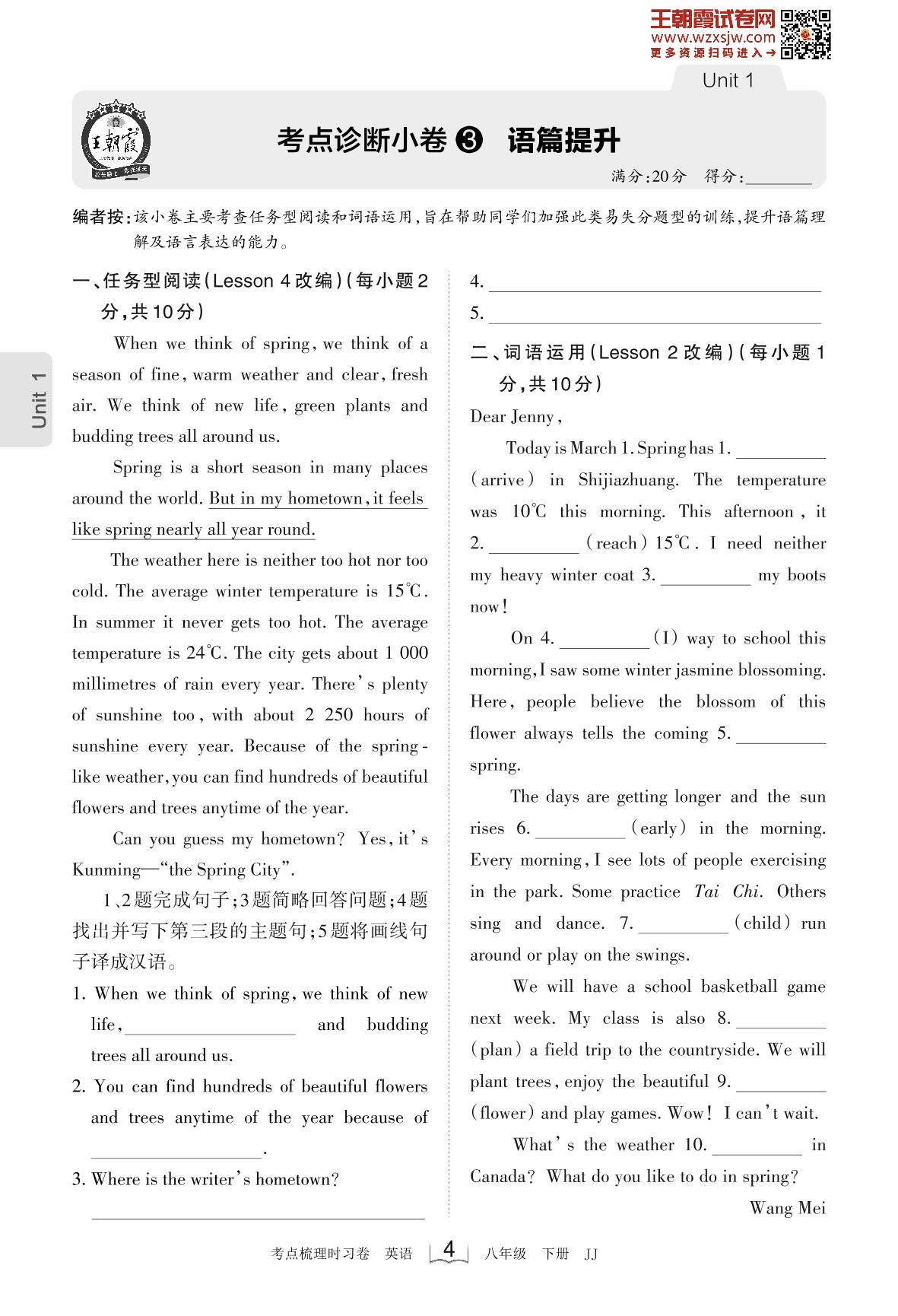 2023下册八年级英语冀教版 Unit 1 考点诊断小卷3 语篇提升
