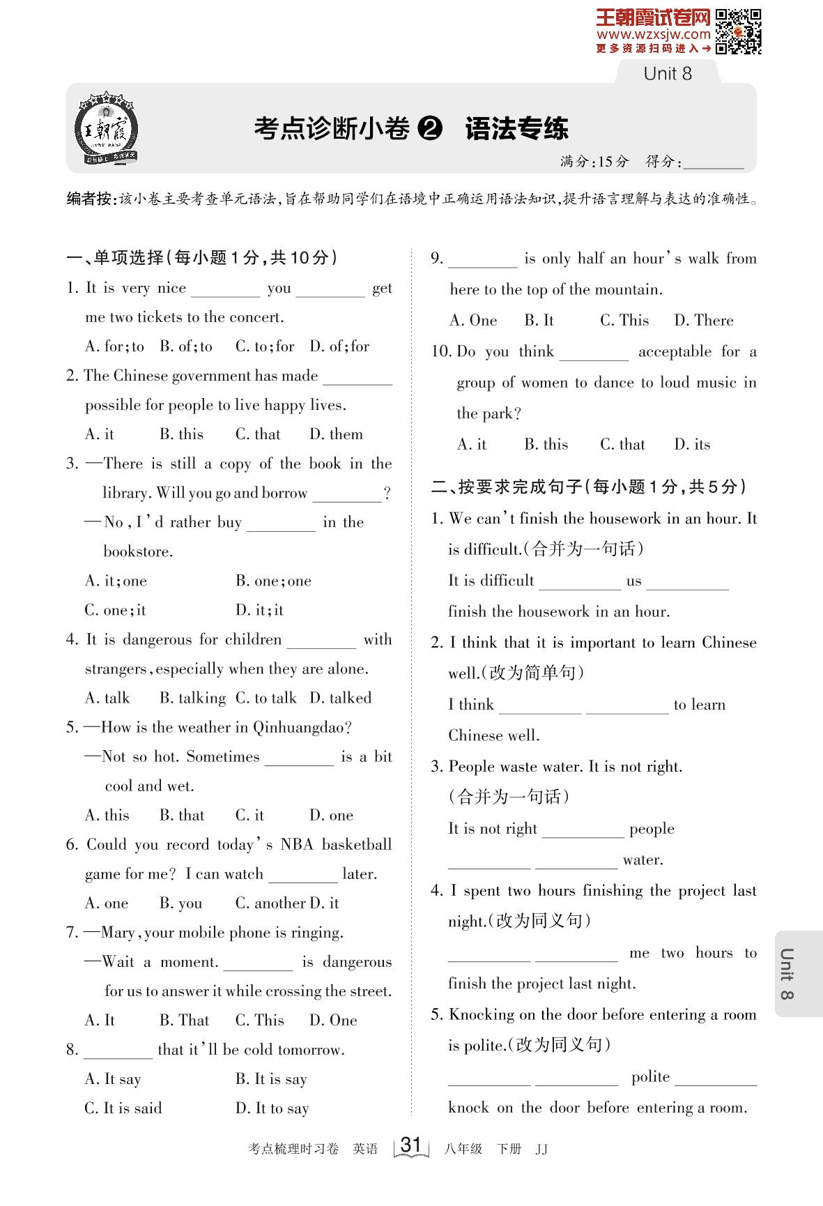 2023下册八年级英语冀教版 Unit 8 考点诊断小卷2 语法专练